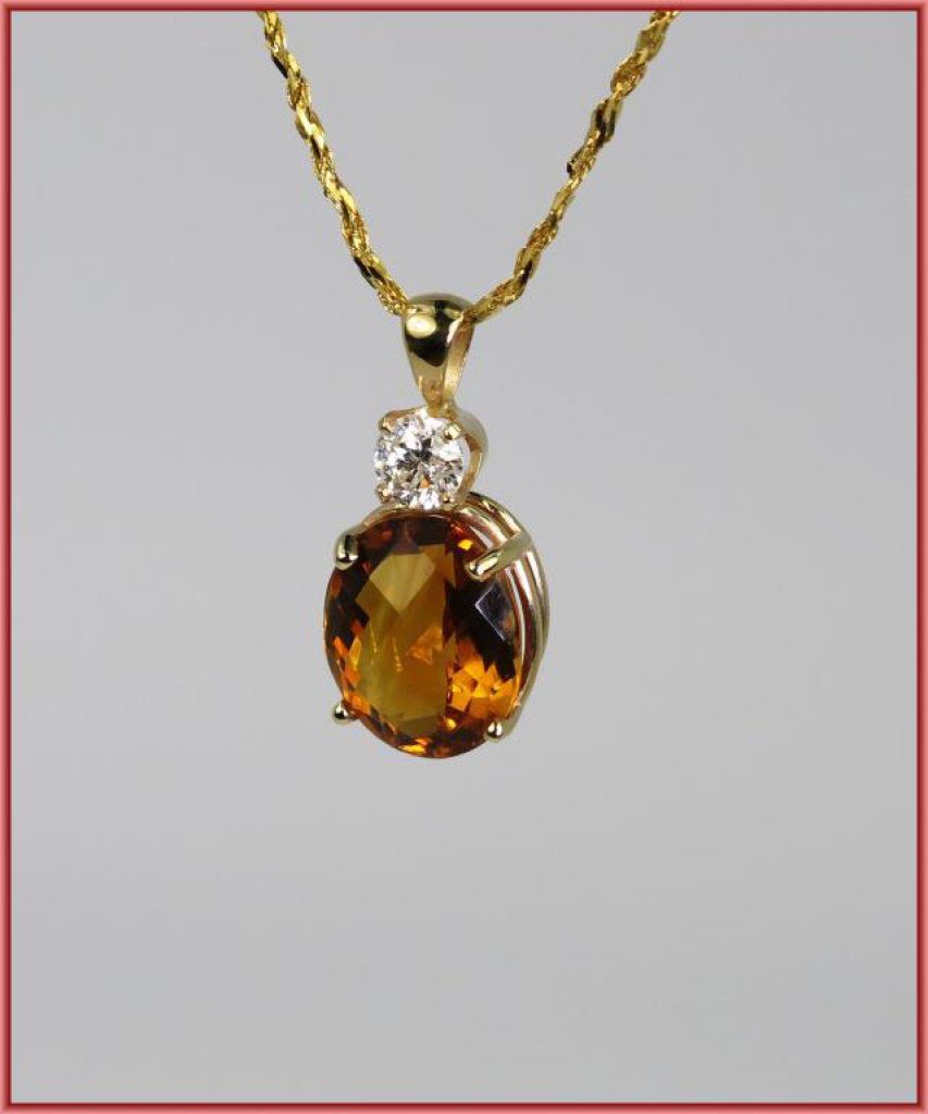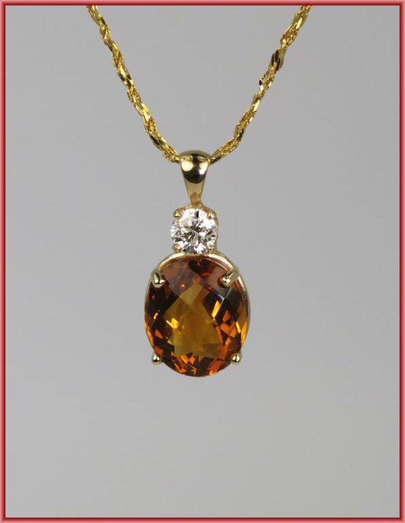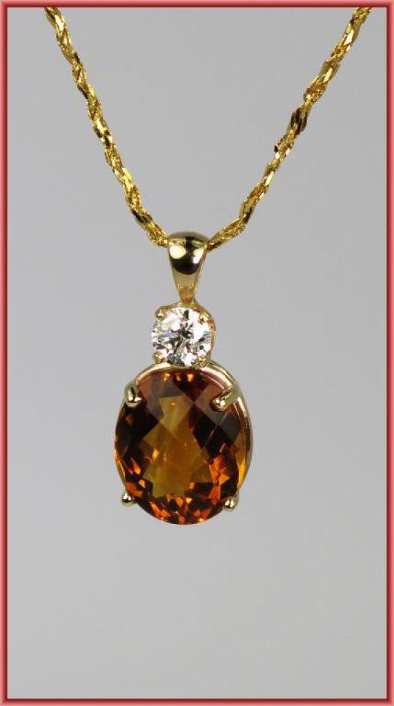 Alluring Oval Citrine and Diamond Pendant featuring an approx. 4.00 carat checkerboard citrine with strong orange/yellow color accented with 0.40 round brilliant cut Diamond with F-G colors set in 14 karat yellow gold. NEW Piece. Retail $1,500-$2,000 Estimate $800-$1,200