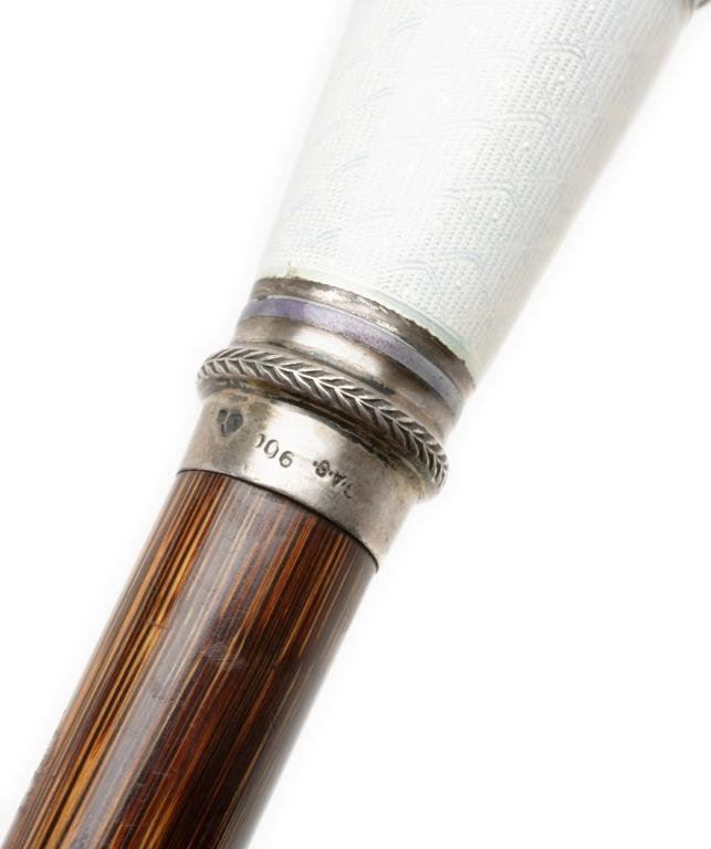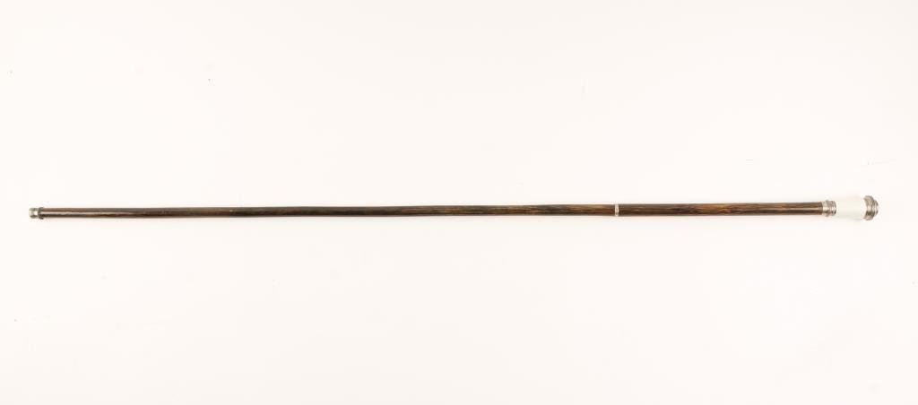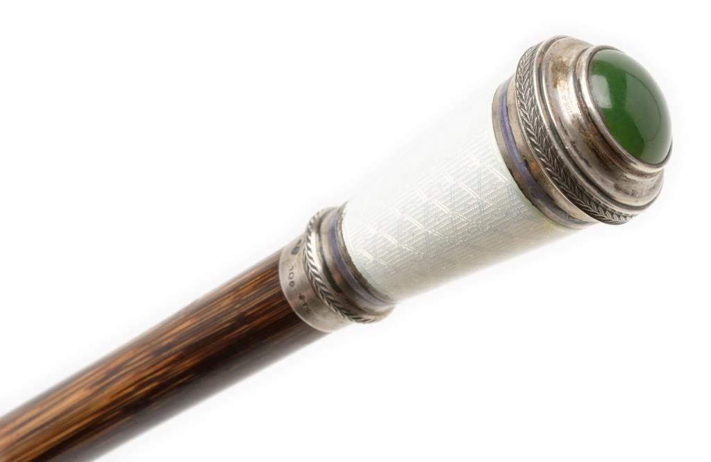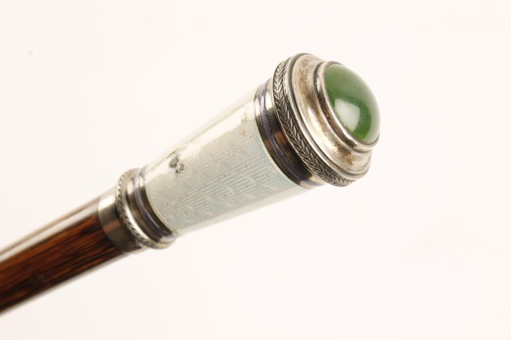 Elegant walking stick from 19th to 20th Century; rosewood shaft, silver and white enamel with green jade Cabazon in top. Est.: $300-$600.