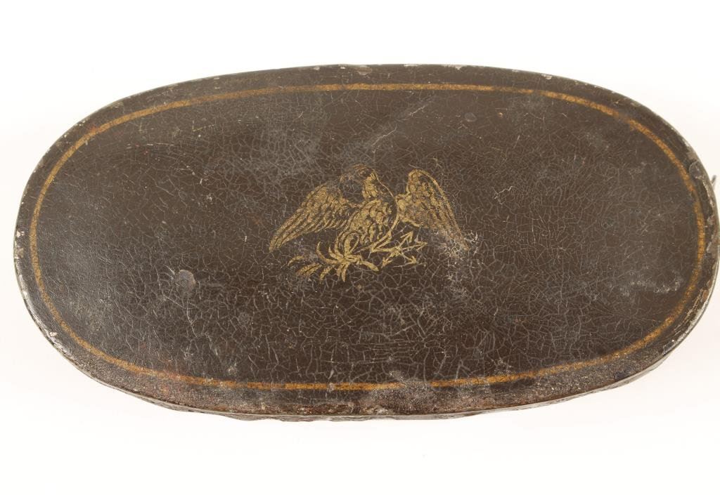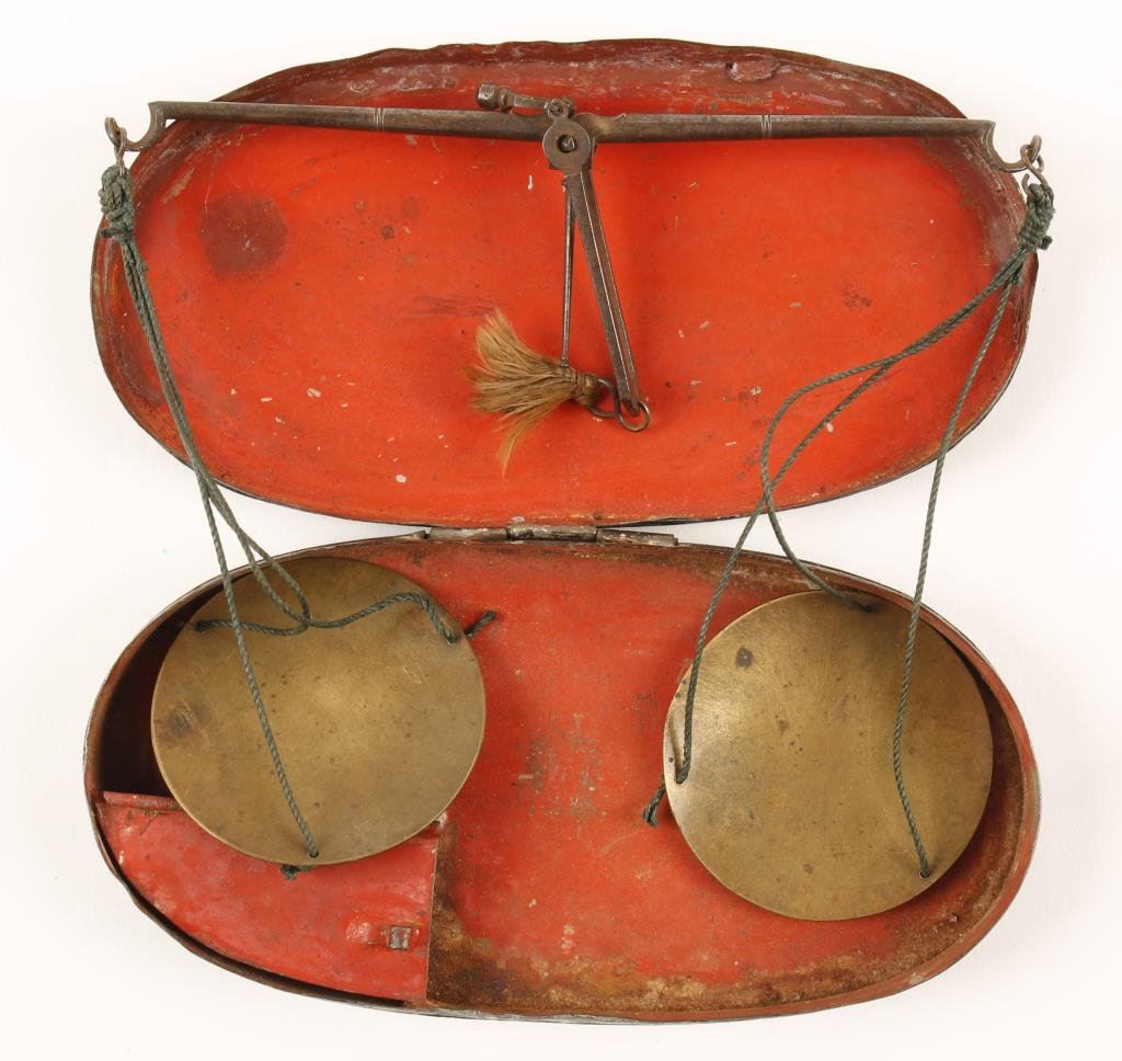 Pocket size gold scales in Japanned tin case showing eagle on the lid circa mid 19th century. 3 weights and string construction. In good to very good condition. Type carried to the California Gold Rush. Est.: $300-$600