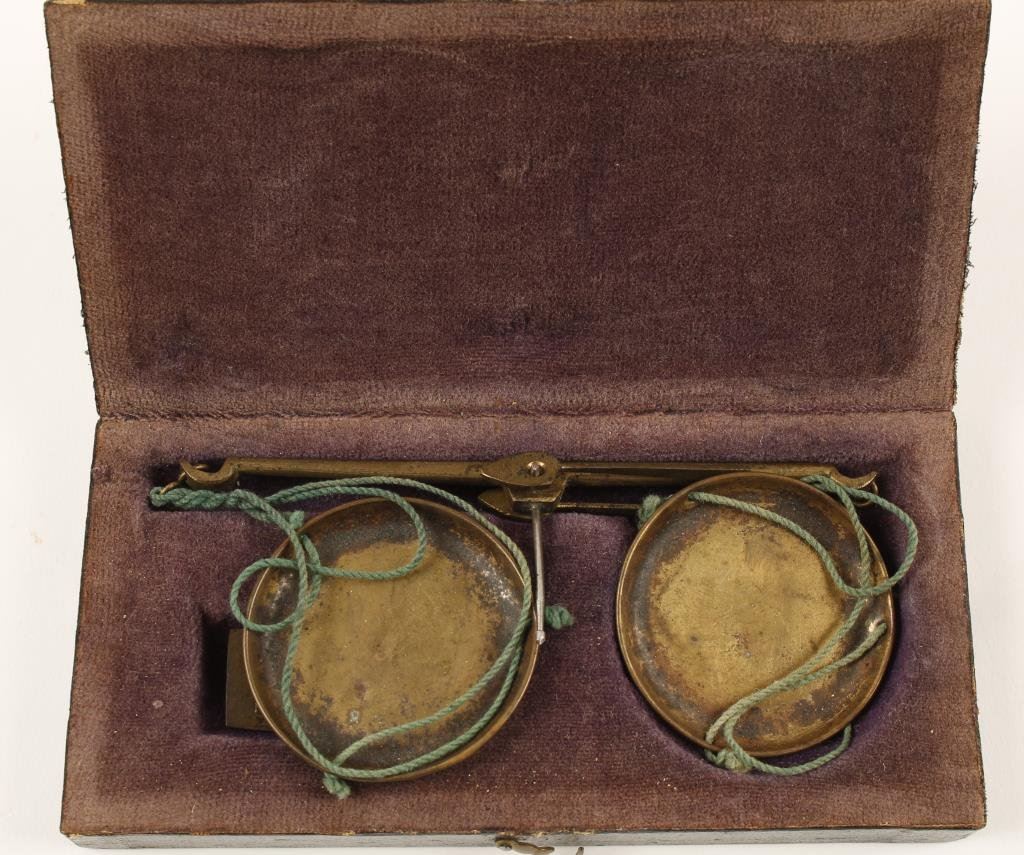 Deluxe cased pocket size gold scales with eagle on the lid. Velvet lined leather covered box with embossed gold American eagle. In very good plus condition with string construction from the mid 19th century along with 2 weights. Est.: $300-$600