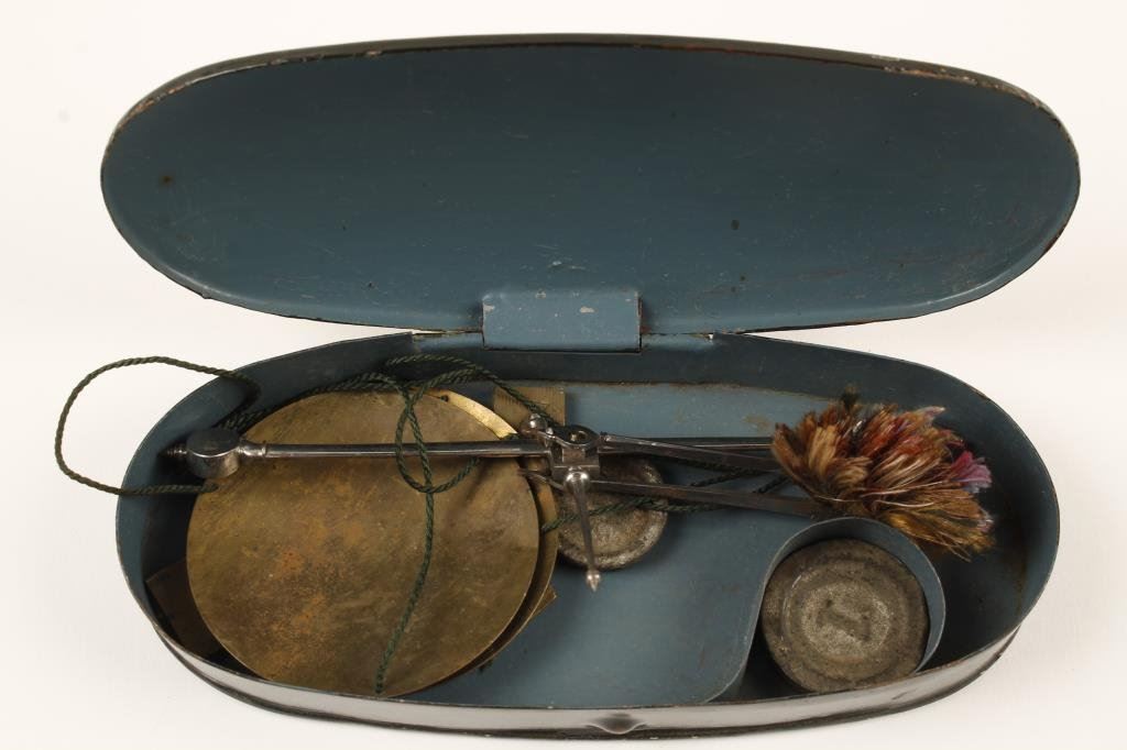 Lot 1226b Painted tin box containing gold scales of larger size with many weights an
