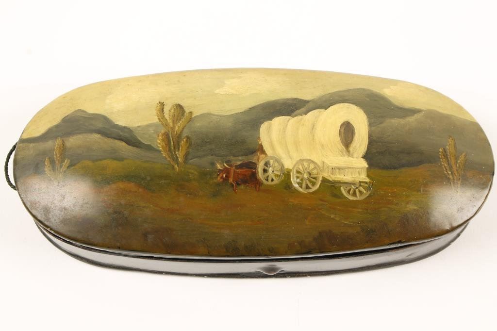 Painted tin box containing gold scales of larger size with many weights and string construction. From the 19th century. The lid shows a well done portrait of covered wagon being pulled by an ox with western landscape and cactus probably Arizona or California. Period art work. Est.: $400-$800