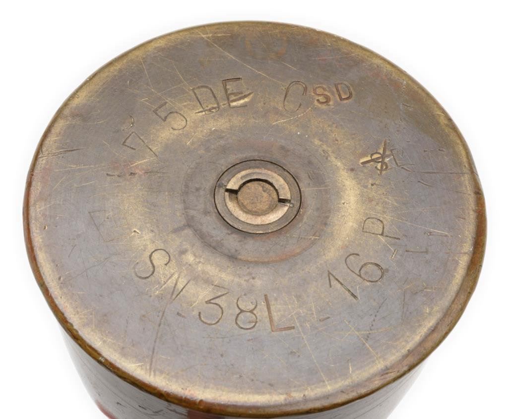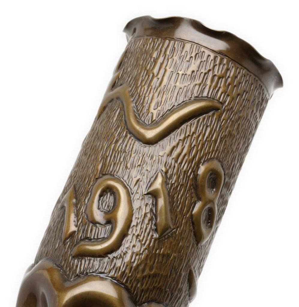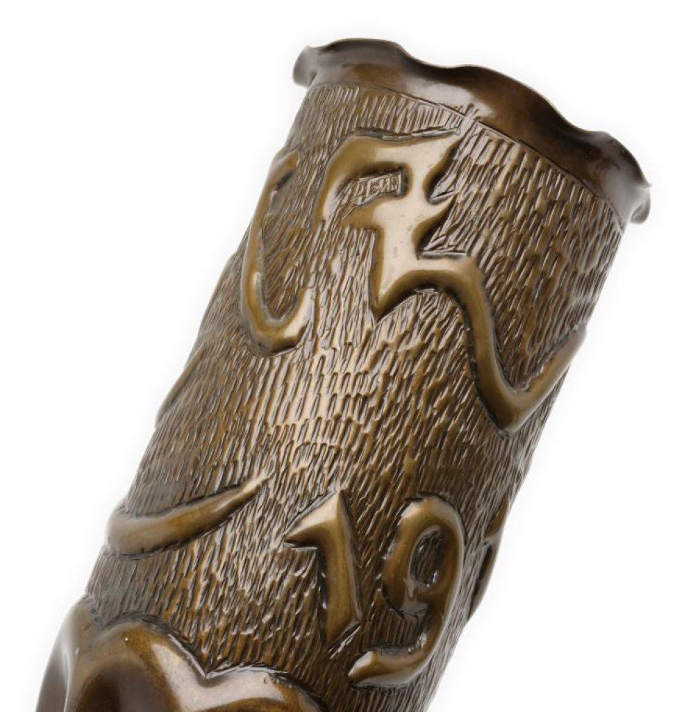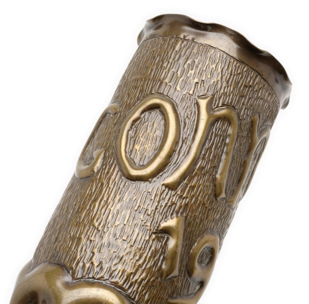 Pair of large pieces of WW I “Trench Art” brass artillery shells, each approximately 11.5” in height and decorated en suite, one marked “Argonne 1918” and one marked “Merz 1918”; both with dark patinas. Est.: $200-$300.