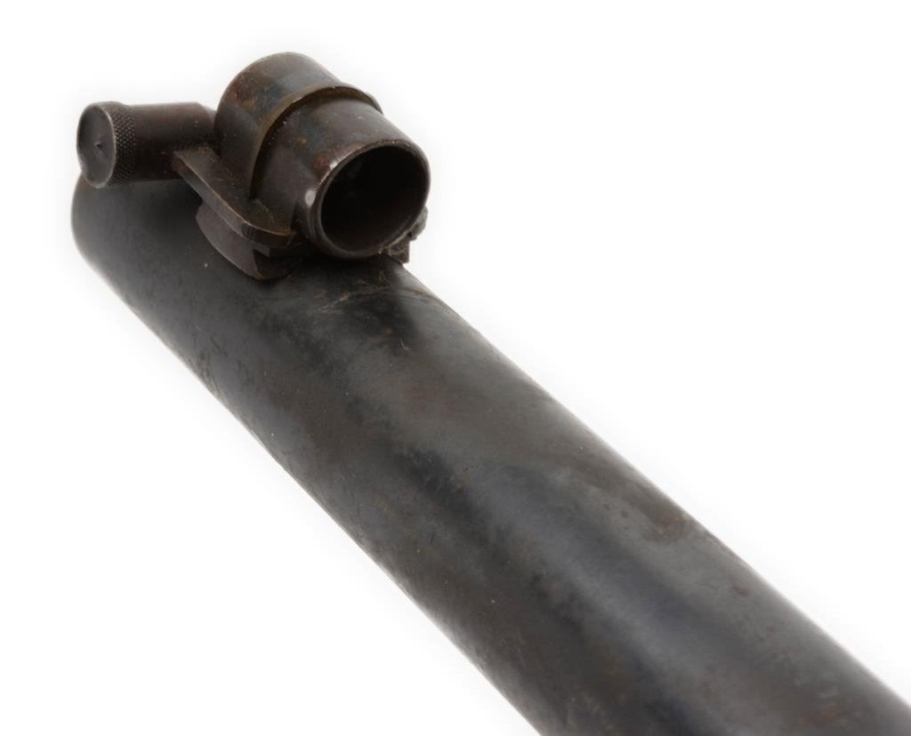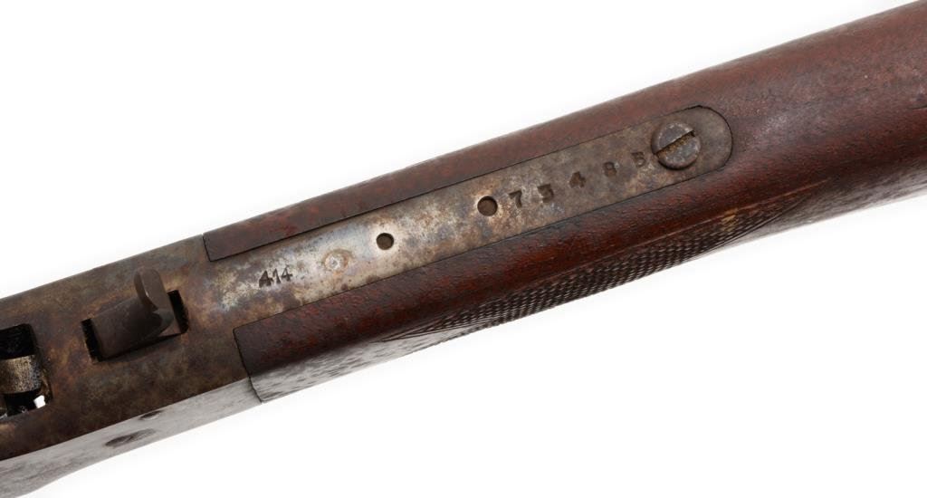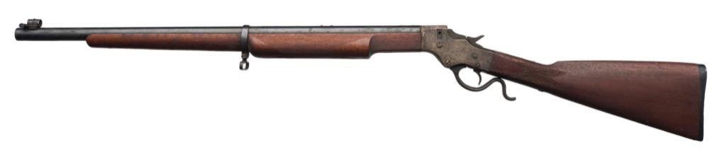 *Stevens falling block single shot rifle, .22LR caliber, 26” round barrel, S/N 73485, blued and case hardened finish, checkered wood stocks in overall un-cleaned condition; considerable original blue and case colors under layer of grime, very good bore, good action. Barrel shows a number of tapped holes for scope mounts with front adjustable hooded sight present. The wood fore stock is good; the butt stock has a couple of chips at the upper tang and two drilled holes. Some careful cleaning and TLC should improve this gun’s appearance considerably. Est.: $150-$300.