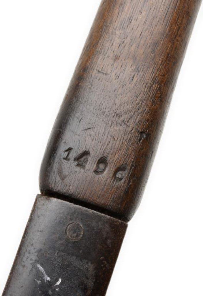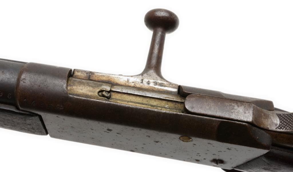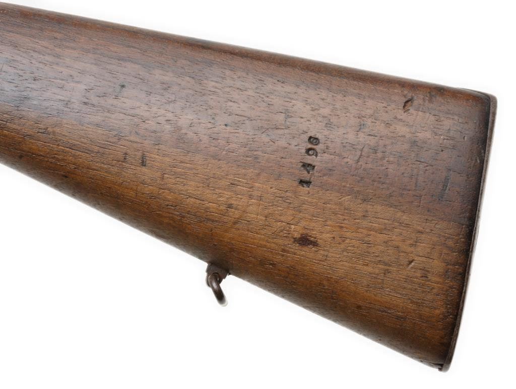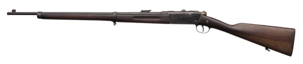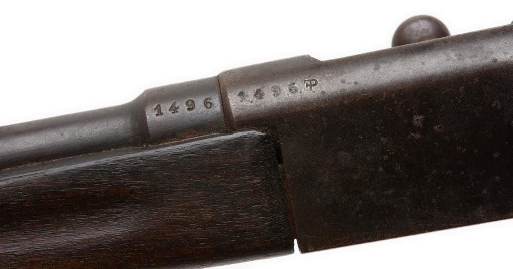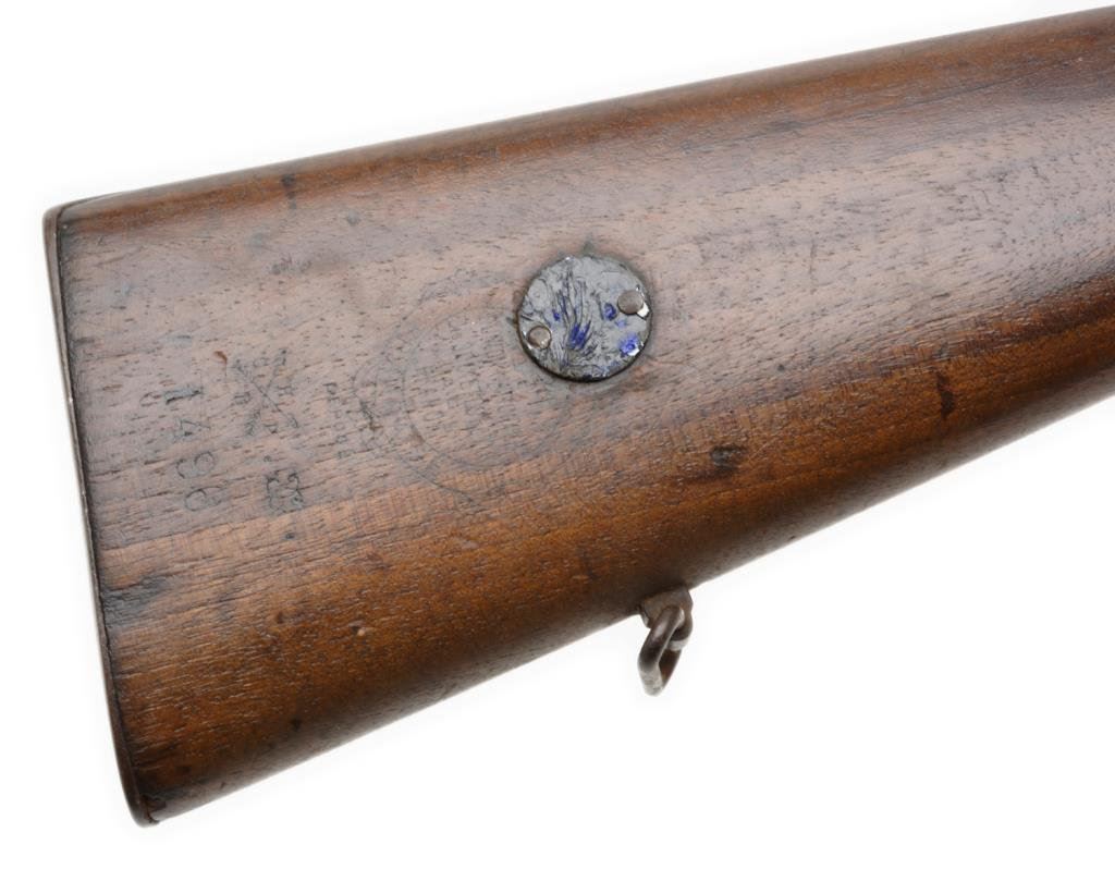 Lebel Model 1886 trainer or Cadet rifle, .22RF caliber, 25” round barrel, S/N 1496, blued finish, wood stocks in overall fair to good condition with sling swivels and disc attached to right side of butt stock. Est.: $150-$300.