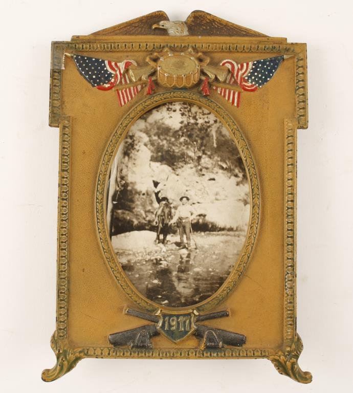 Cast iron and gold painted patriotic frame with eagles, stands of flags, cannons and 1917. Old photo of a man with horse holding a gun. Looks like Central to Northern California. Est.: $100-$300