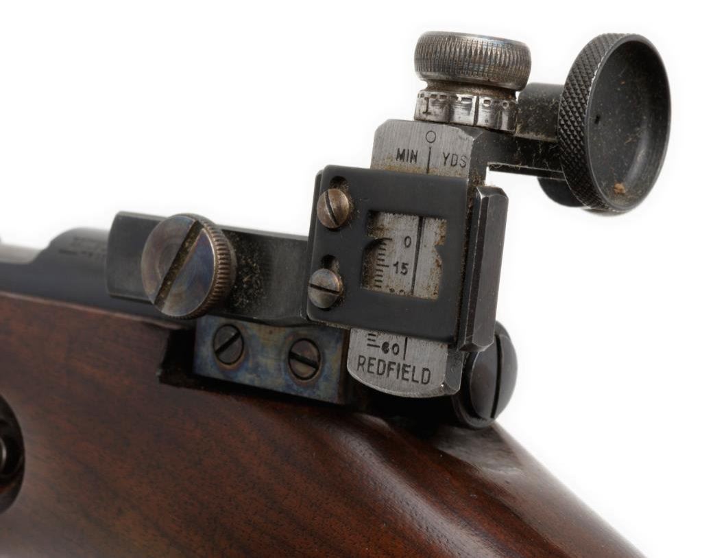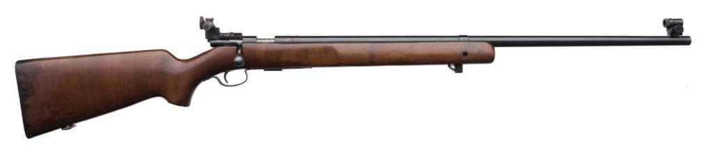 *Winchester Model 75 bolt action rifle, .22 Long Rifle cal., serial #76209. The rifle is in overall fine condition with a 30” blued barrel with hooded front target sight, drilled and tapped in two additional locations on the barrel and ending with a Redfield receiver sight. The rifle retains nearly all of its blued finish and shows little use. The smooth wood target stock is in overall very good condition aside from some staining at the butt due to poor storage and rust on the checkered steel butt plate. The rifle comes with one Winchester marked magazine. The bore is very good, the action crisp and markings sharp on this rifle. Est.: $300-$600.