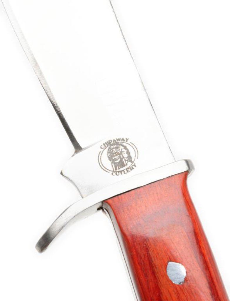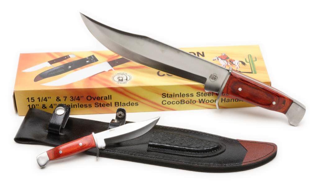Oregon Trail Combo knife set with sheath and cardboard box; Largest knife is 15.25” overall with a 10” blade and the smaller knife is approximately 8” overall with a 4” blade; both in like new condition and accompanied by a leather sheath that permits the carry of both knives. Est.: $150-$200.