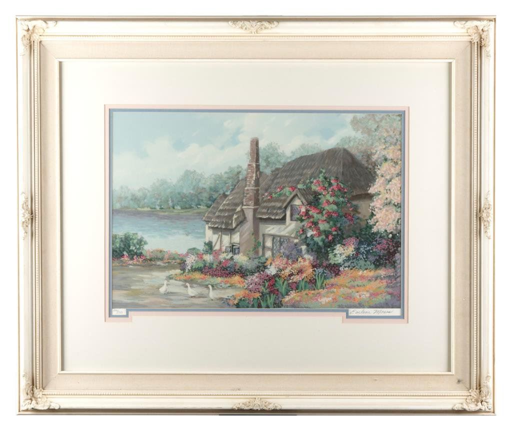 Framed and custom triple matted limited edition (206/300) hand signed color print of and English cottage and lake by listed contemporary artist Erlene Moses, approximately 31” x 36” overall. Est.: $175-$350.