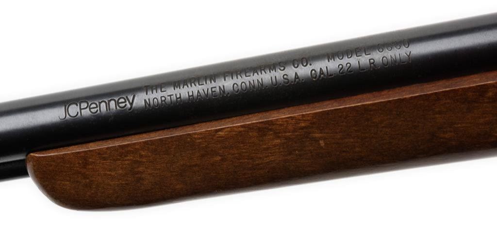*J.C. Penney-marked Marlin Model 6660 semi-automatic rifle, .22LR caliber, 22” round barrel, S/N 26252735, blued finish, wood stock in overall very good condition with majority of original finish, very good bore, action, markings and wood. Est.: $100-$200.