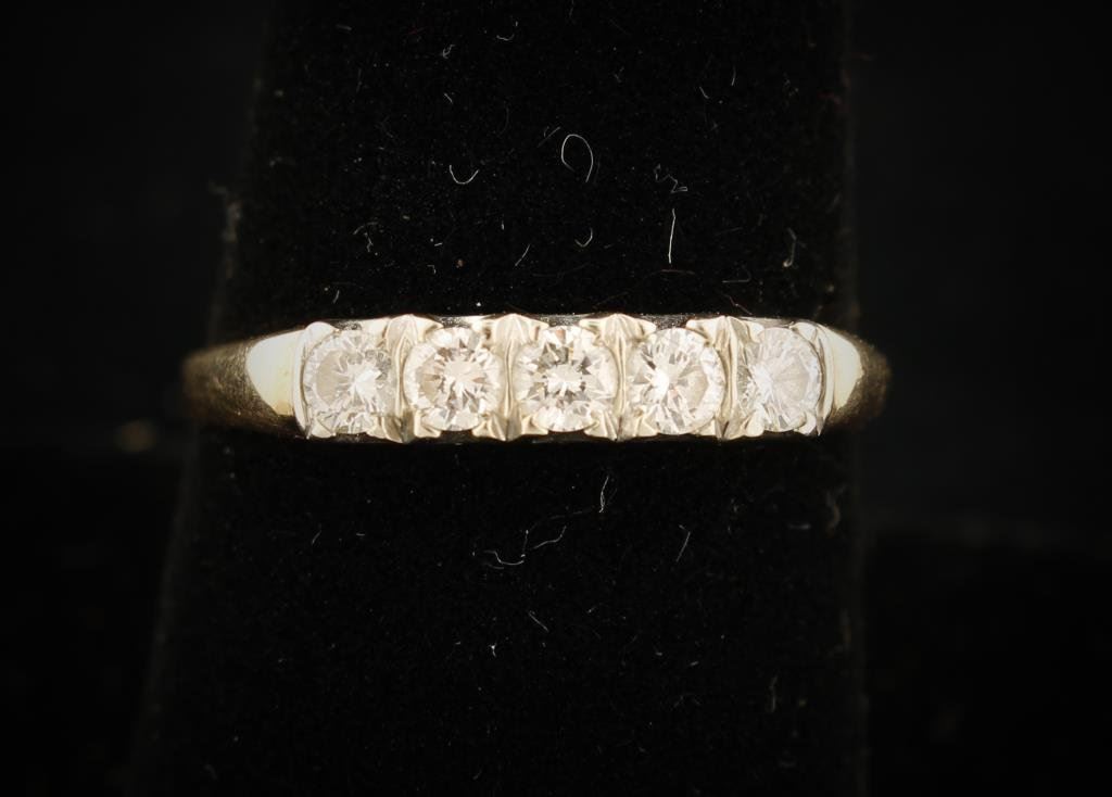 Diamond band with 5 old cut good quality diamonds. Approximately 30 points total in gold band (unmarked) tests 10-14K. White stones. Est.: $100-$300