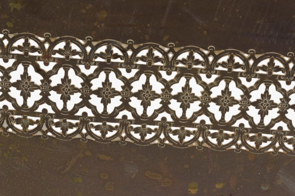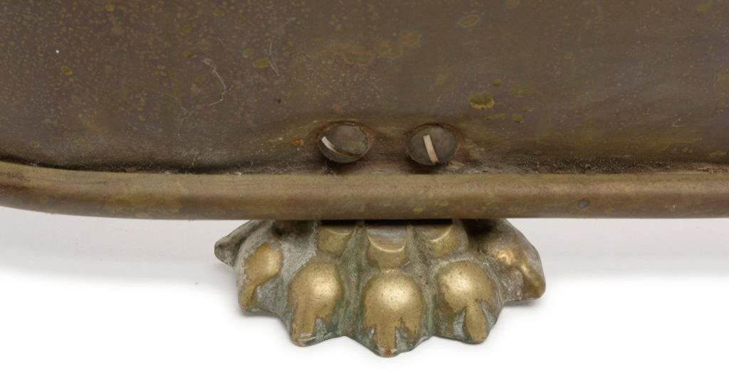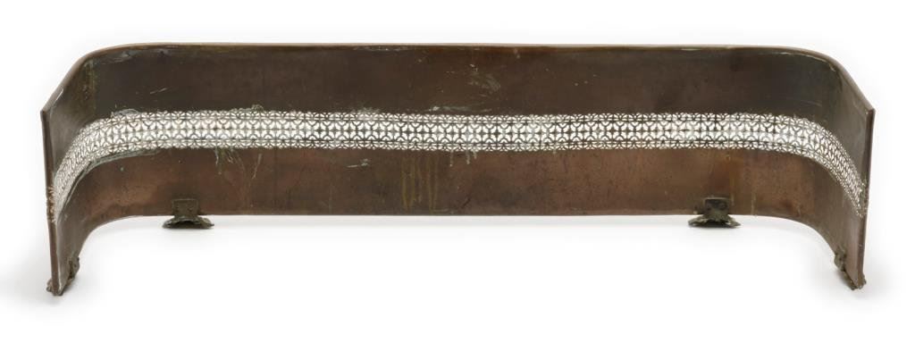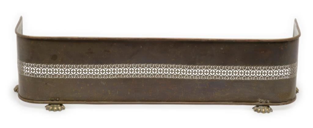 Decorative brass fireplace screen, approximately 42.5” wide and 11” in height with end curves of 11”; brass feet; overall good condition with a pleasing dark patina. Est.: $100-$150.