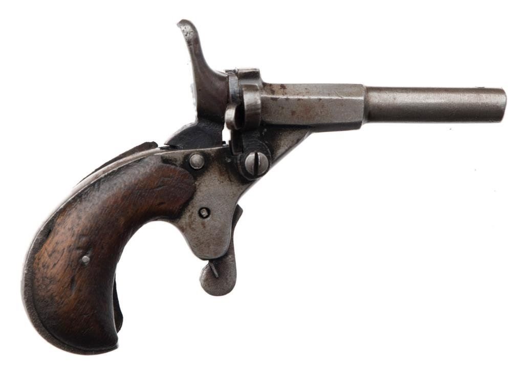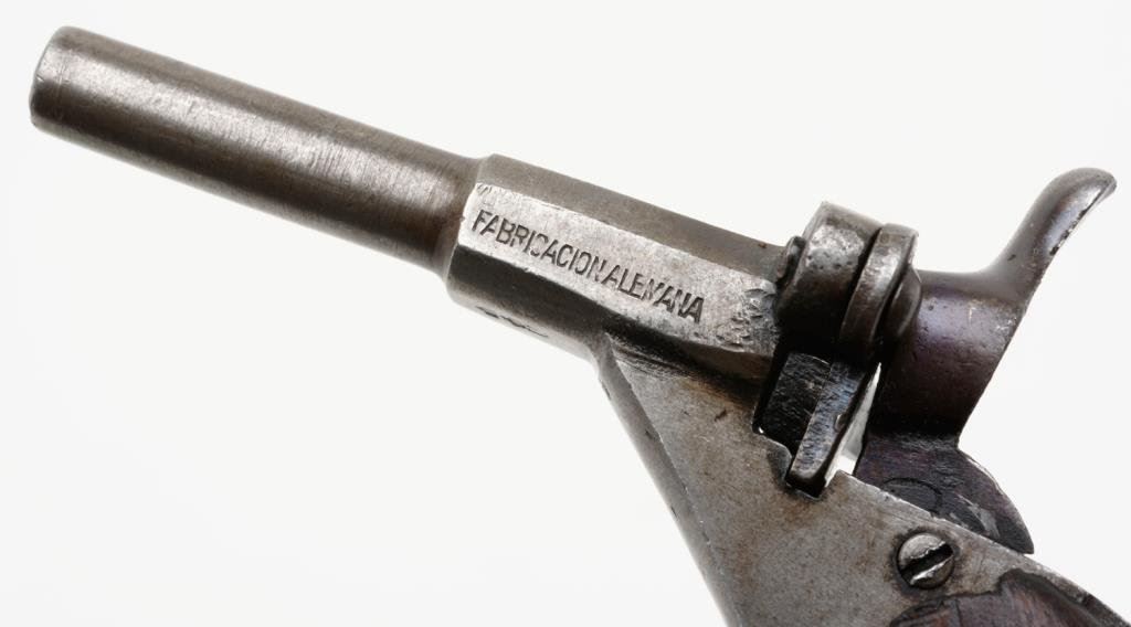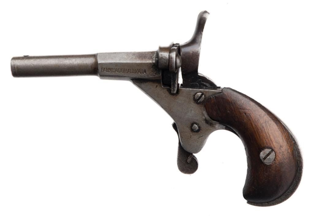 Antique single shot small pistol, .22 caliber, 2.25” barrel marked “FABRICACION ALEMANA”, no S/N, blued finish, wood grips, approximately 4” overall and in good condition showing some hints of blue in protected areas, grey patina otherwise, crisp action, fair bore and good grips; an interesting little breechloader. Est.: $50-$100.