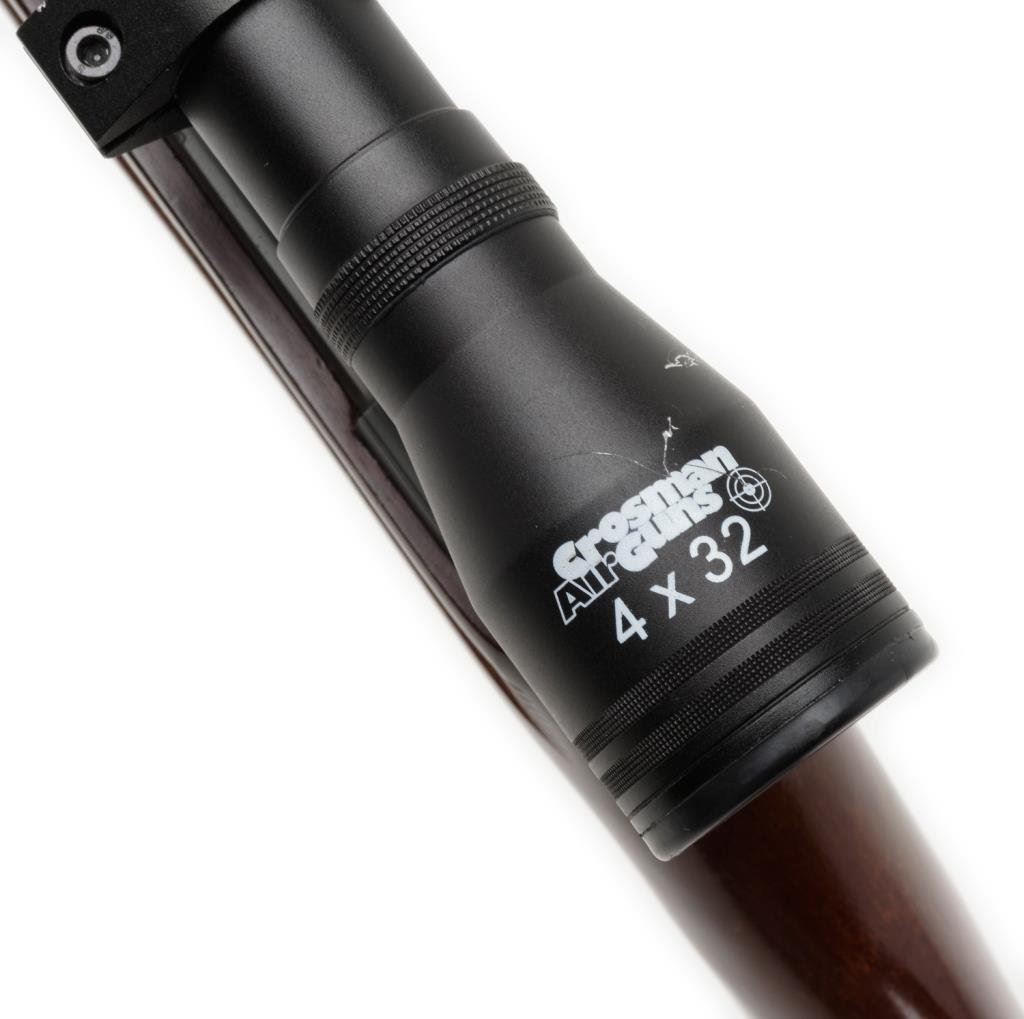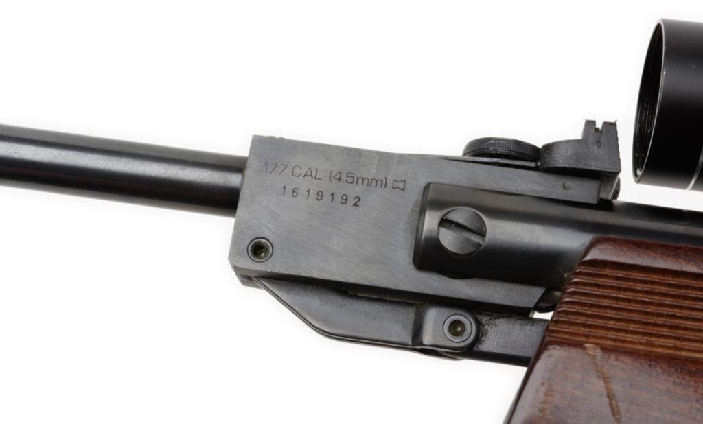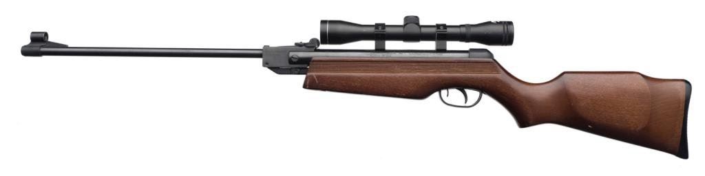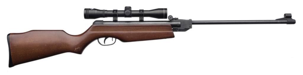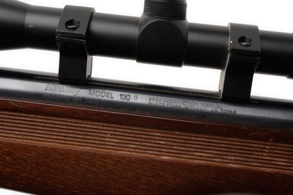 Daisy Model 130 air rifle, .177 caliber, 18” barrel, S/N 1619192, blued finish, wood stock, mounted with a Crosman AirGun 4X32 scope displaying fine optics. This airgun is in very good to fine overall condition with a fine bore, the majority of its blued finish and very good wood stock; working at time of description. Est.: $75-$150.