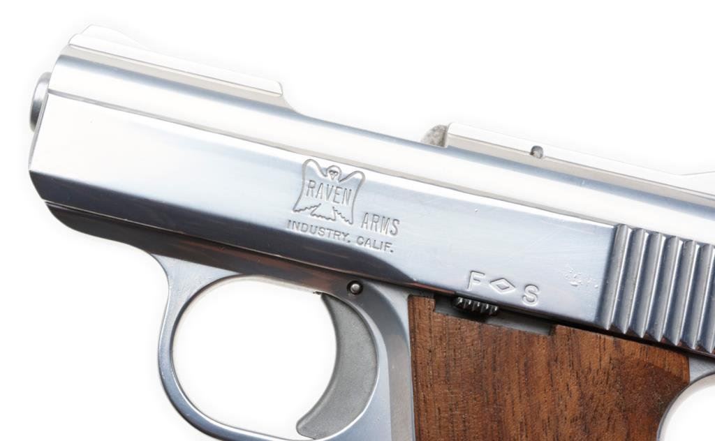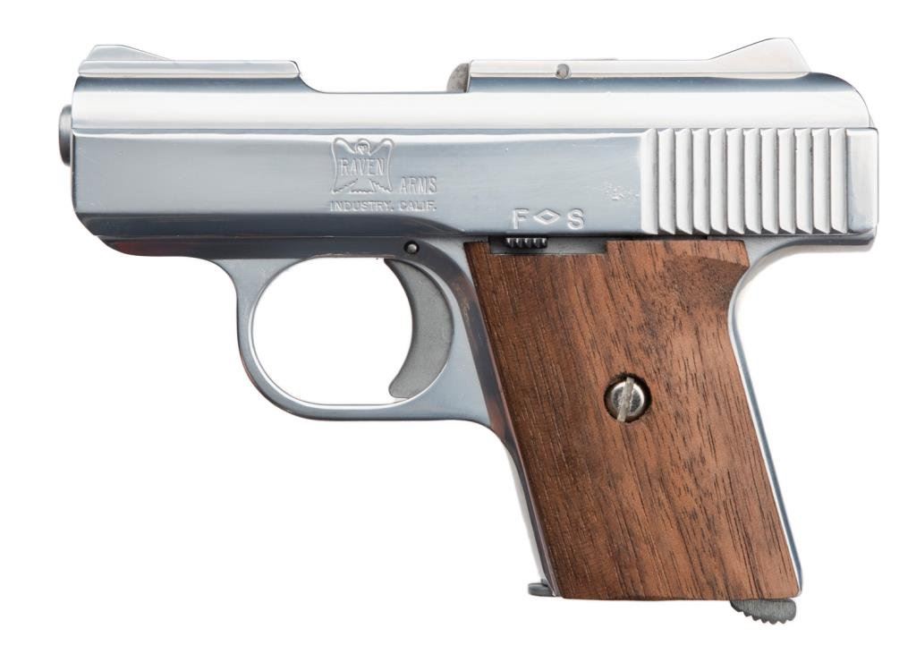 *Raven Model MP-25 pocket semi-automatic pistol, .25 caliber, 2.25” barrel, S/N 947095, in fine condition. Est.: $75-$150.