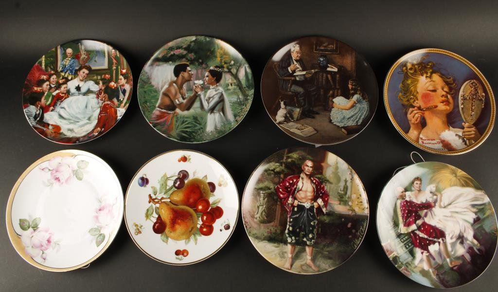 Lot of 8 collector plates including a Knowles China Co. Bradford Exchange Norman Rockwell’s “Making Believe at the Mirror” in factory box with certificate; another Bradford Exchange Rockwell “The Storyteller” in factory box with certificate; a Bavarian plate with roses; a Bavaria “DEBRA” plate with fruit; a Knowles/Bradford Exchange plate “Shall We Dance?” from the “King and I” series; another “King and I” series plate entitled “A Puzzlement”; another from the same series, “We Kiss in a Shadow”; and the last, “Getting to Know You” from the same series. Est.: $75-$150.