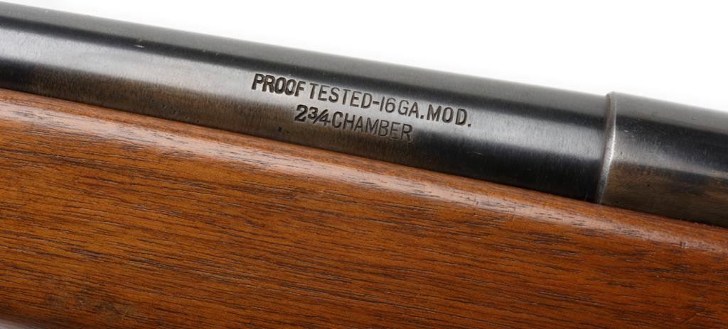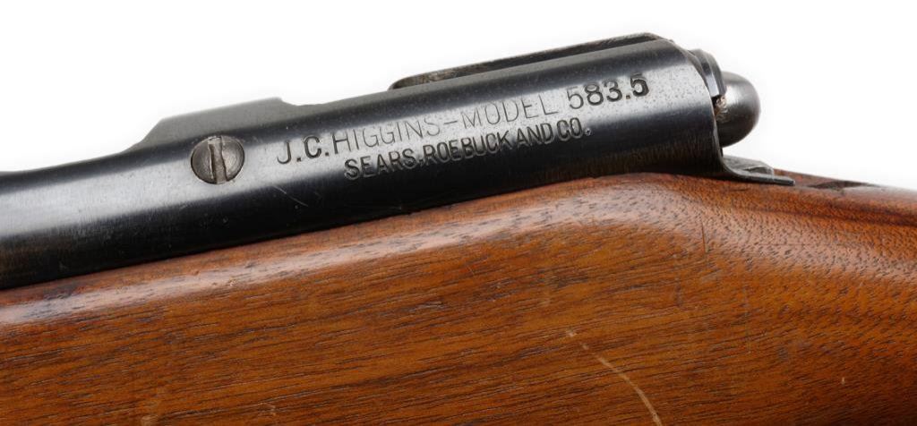 *J.C. Higgins Model 583.5 bolt action shotgun, 16 gauge, 26” barrel, no visible S/N, blued finish, wood stock in overall fine condition with fine bore, crisp action, sharp markings and fine stock. Est.: $75-$150.