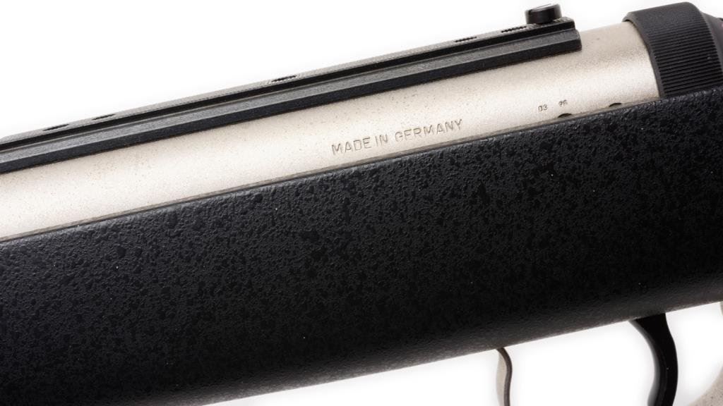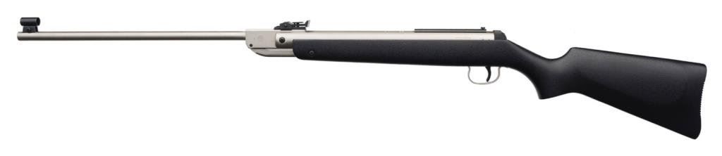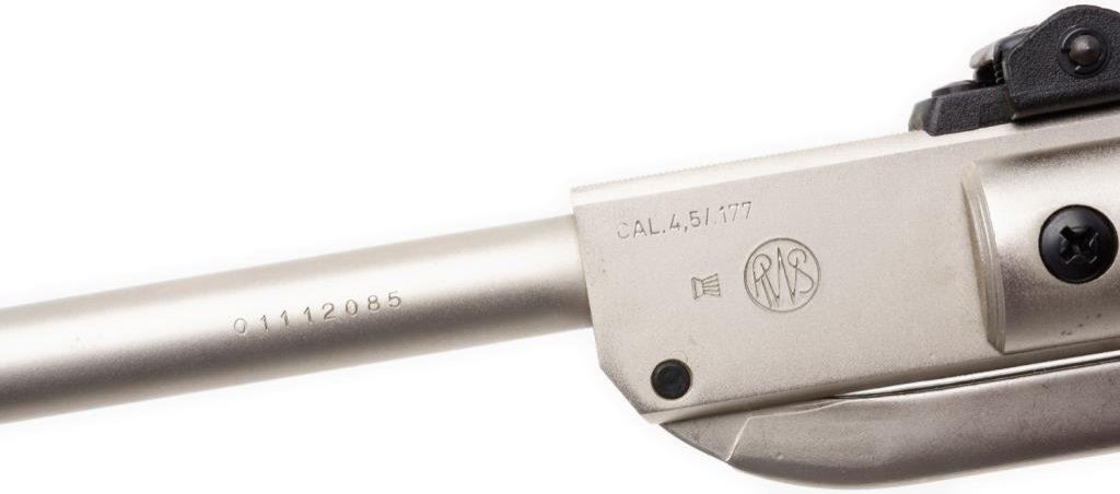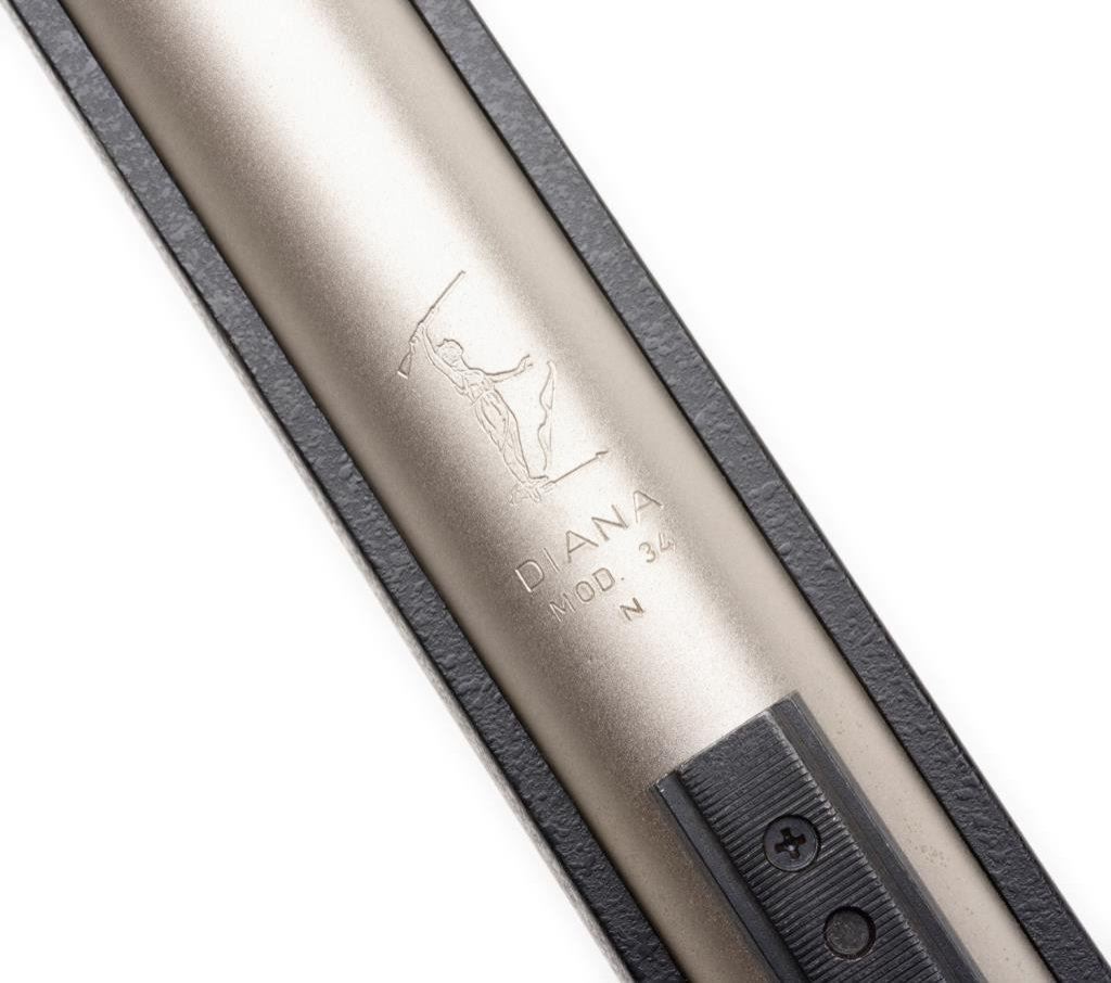 RWS Diana Model 34 air rifle, .177 caliber, 19.5” barrel, S/N 01112085, brushed nickel finish, black composite stock. This air gun is in overall very good to fine condition showing little use. Est.: $100-$200.