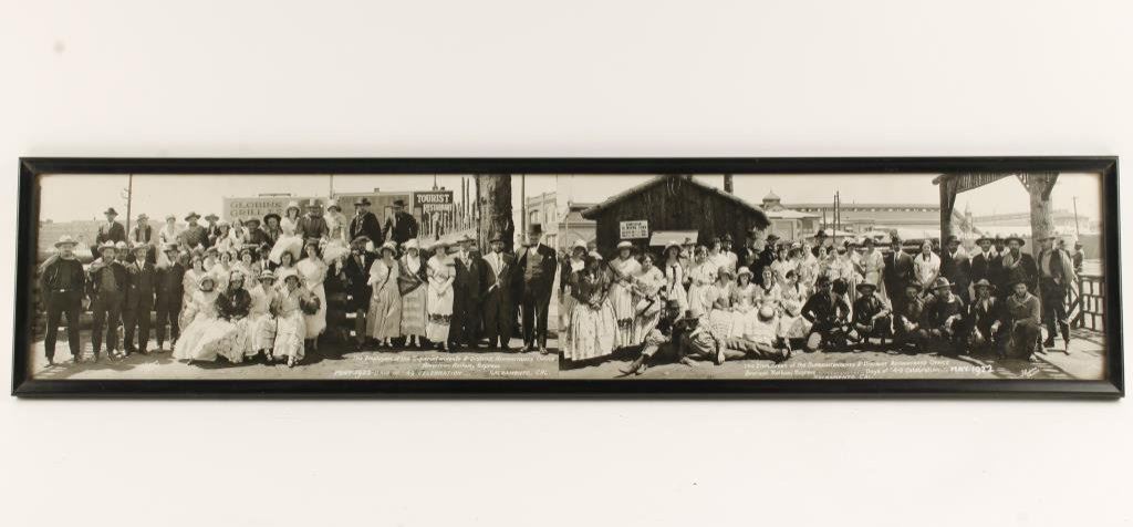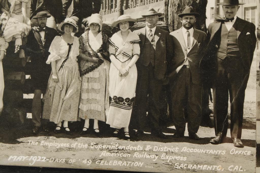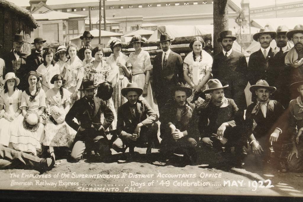 Photograph of employees from American Railway Express, May 1922, Days of 49 celebration, Sacramento, Cal. In front of Globins Grill and Mining town which were tourist attractions. Measures 33” x 6”. Folks are in vintage costume. Est.: $75-$150