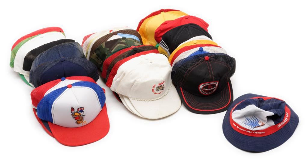 Bonanza lot of approx. 40 advertising hats including racing events, products, 1984 Olympics, etc.; the late John Ewald’s lifetime collection from his drag racing career (1970-2015). Est.: $100-$300.