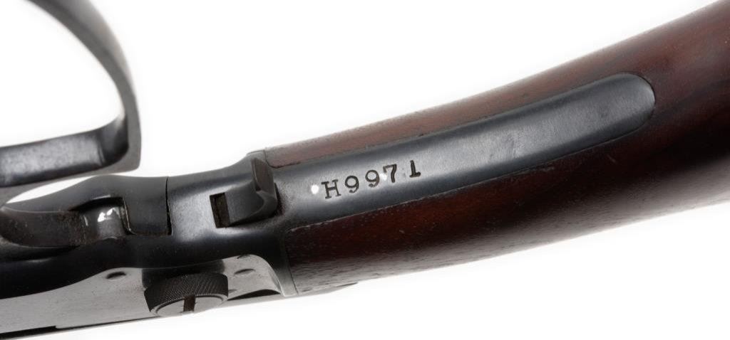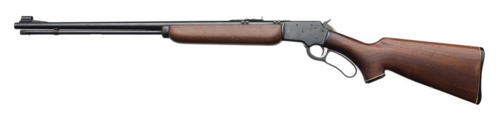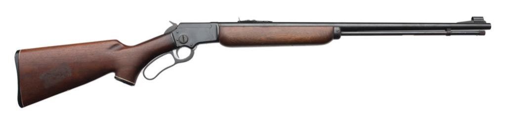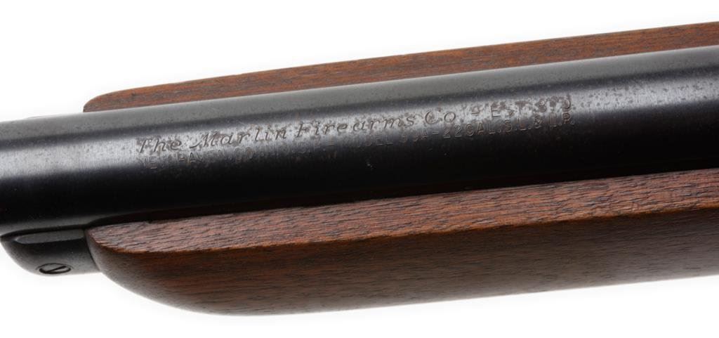 ++Marlin Model 39A lever action rifle, .22 short, long and LR caliber, 24” round barrel, S/N H9971, blued finish, wood stocks in overall very good un-cleaned condition displaying the majority of its original finish, crisp action, good markings and overall very good bore. Left side of barrel at breech is tapped and screwed for scope base. Est.: $150-$300.