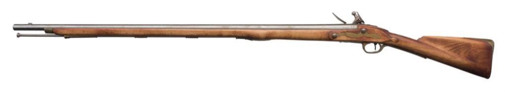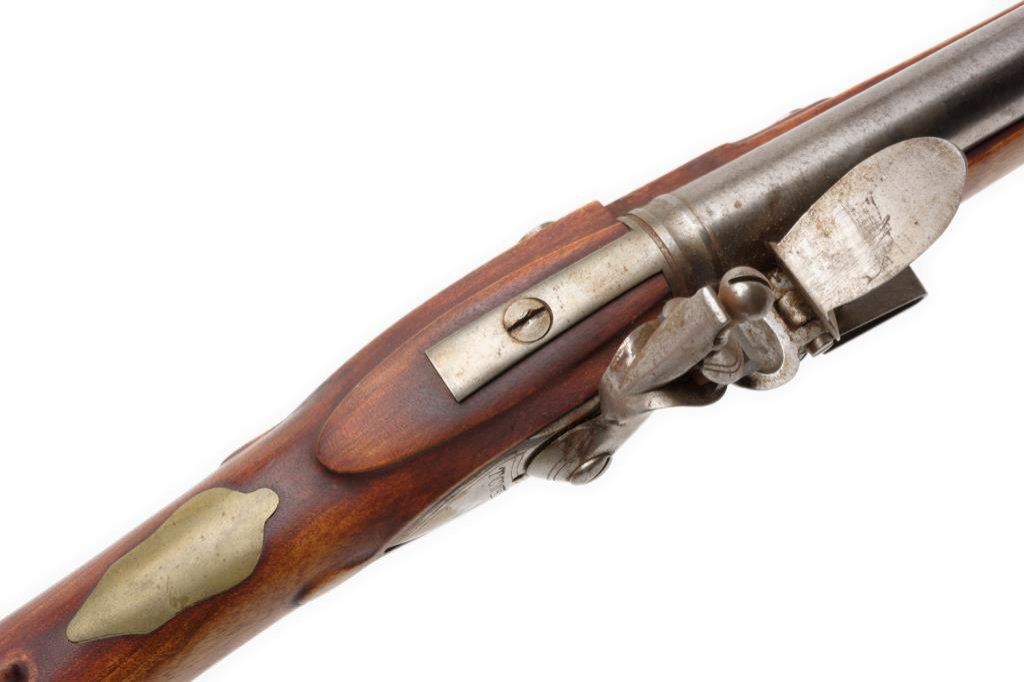 Reproduction of a Tower Brown Bess flintlock rifle, .75 caliber, 41.5” barrel, S/N 212, “in the white” metal, full wood stock with brass mountings. This flintlock is in overall very good + condition showing a light brown patina on metal surfaces, crisp action, good bore and very good wood stock. Est.: $150-$300.