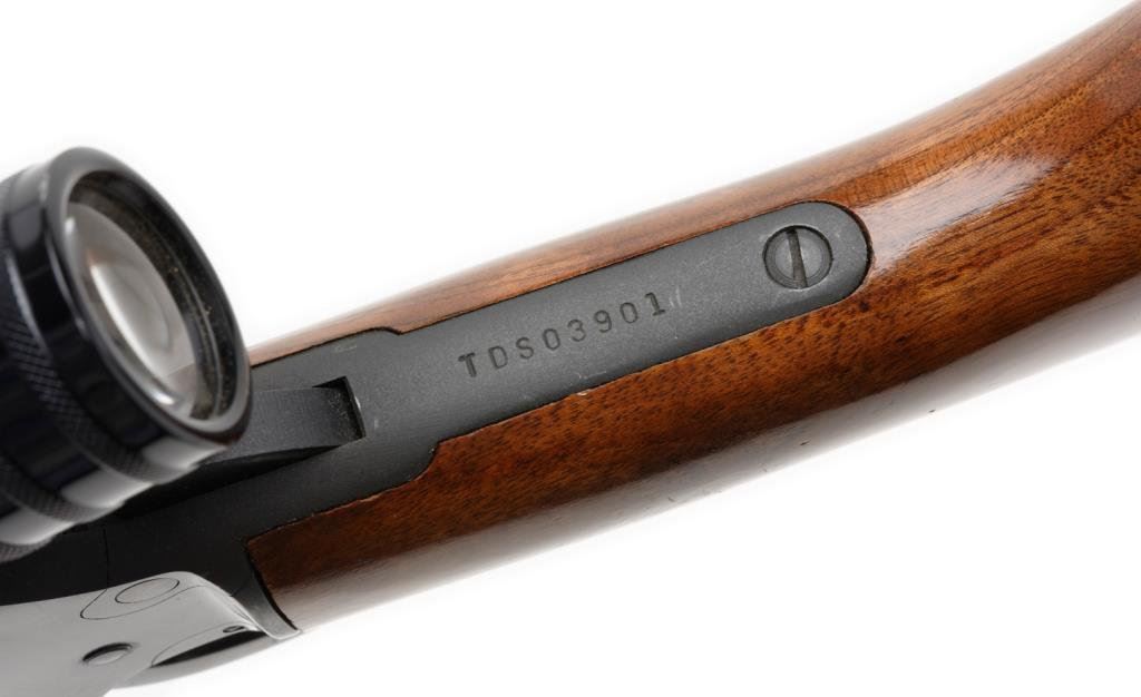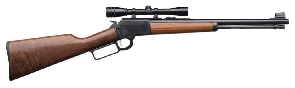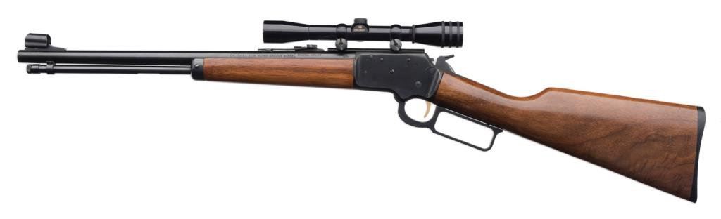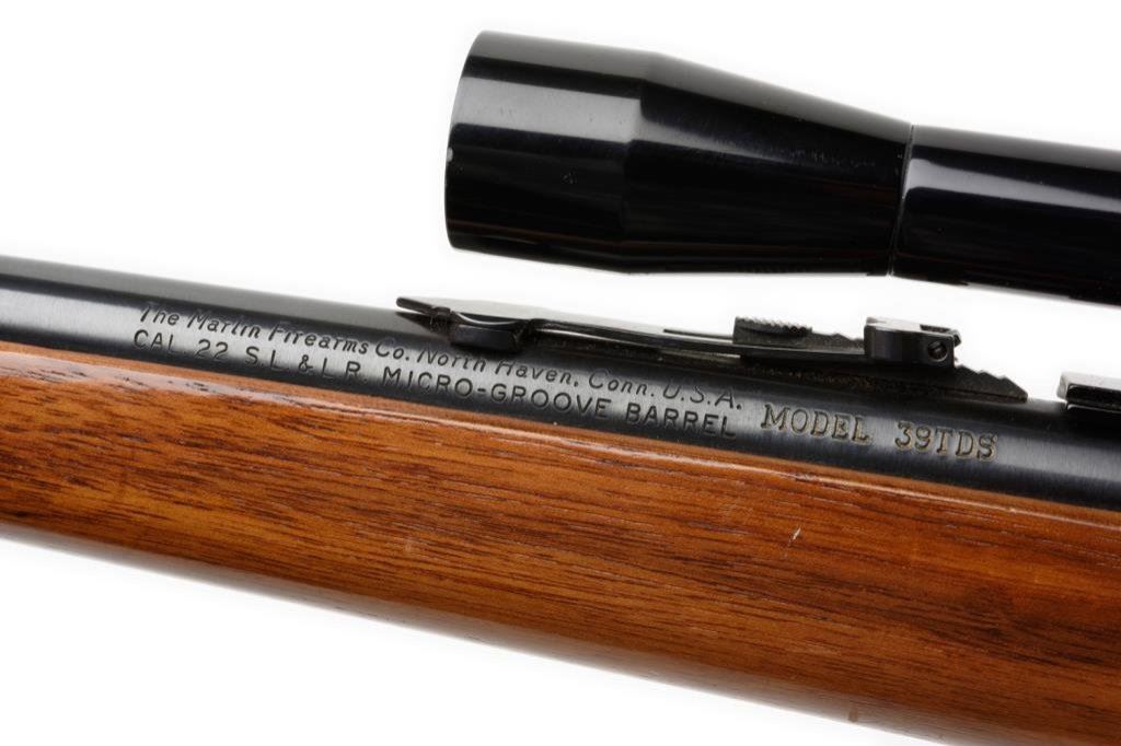 **Marlin Model 39TDS Takedown lever action carbine, .22 Long Rifle cal., serial #TDS03091. The gun is in overall very good condition with a 16” blued barrel, hooded ramp front and folding rear sights. The barrel and action retain nearly all of their blued finish with only slight surface erosion and mars on the barrel. The smooth wood stocks are in overall very good condition with some loss of finish, small mars and a hard plastic butt plate. The bore is very good, action crisp and markings sharp. The gun is topped with a Redfield fixed 4x scope. Est.: $200-$400.