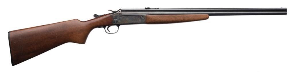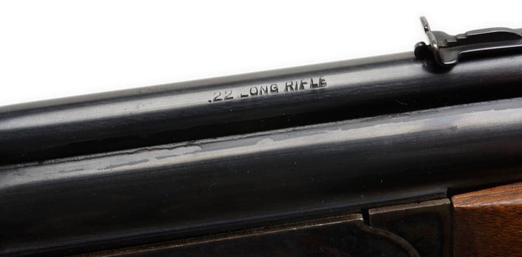 *Savage Model 24 Over/Under rifle, .22 Long Rifle and .410 cal., serial #NSNV. The rifle is in overall very good condition with 24” blued barrels, metal bead front and ramp rear sights. The barrels retain the majority of their blued finish while the receiver shows significant original case color. The smooth wood stock is in overall very good condition with only slight surface mars. The butt stock ends with a plastic butt plate and a 14” LOP. The bores are very good, action crisp and markings sharp on this desirable Savage. Est.: $200-$400.