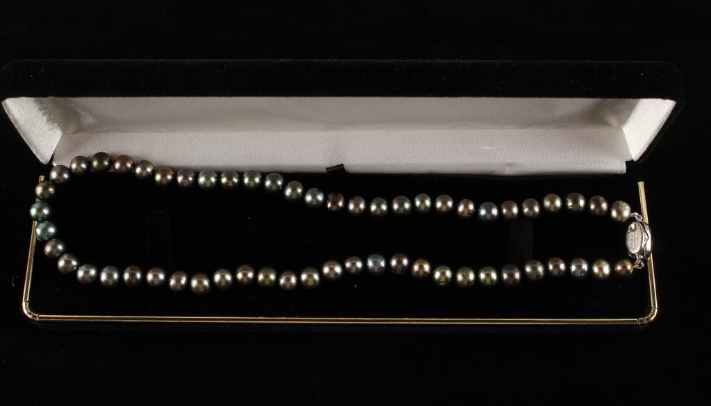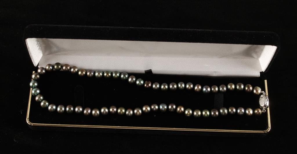 Lot 1348 One strand of fine black Pearls, 8.6mm in diameter and 20 inches long.Est.