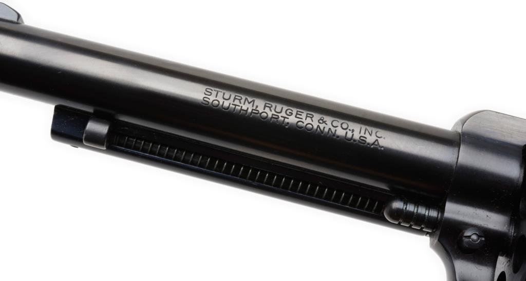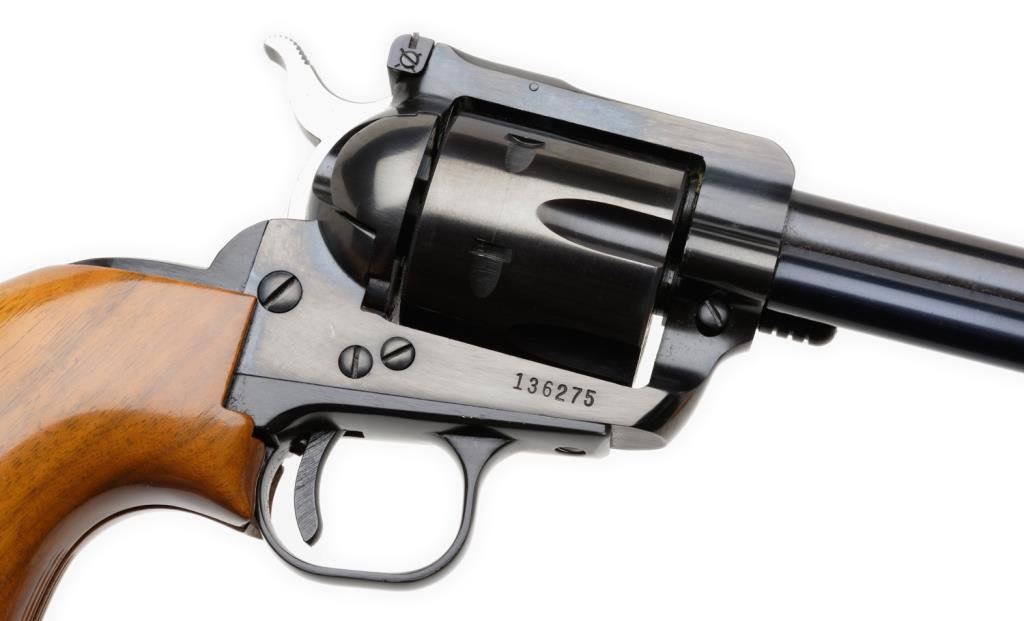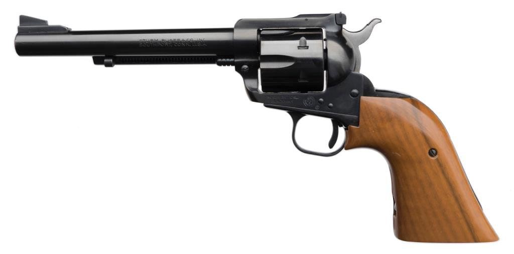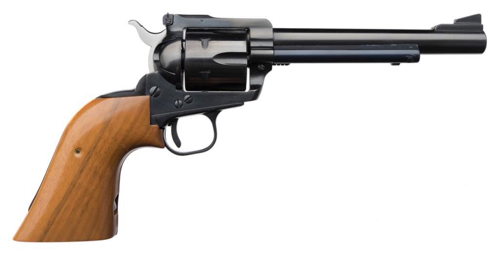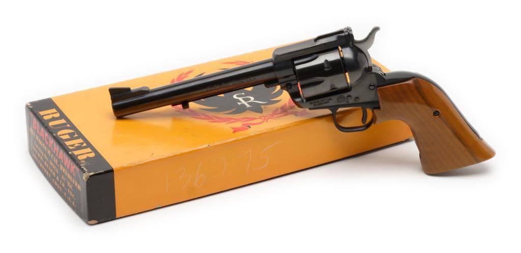 *Ruger Blackhawk Model single action revolver, .357 Magnum caliber, 6.5” barrel, S/N 136275, blued finish, extended wood grips in factory two piece cardboard box. This Ruger is in like new condition showing little handling or use. Est.: $300-$600.