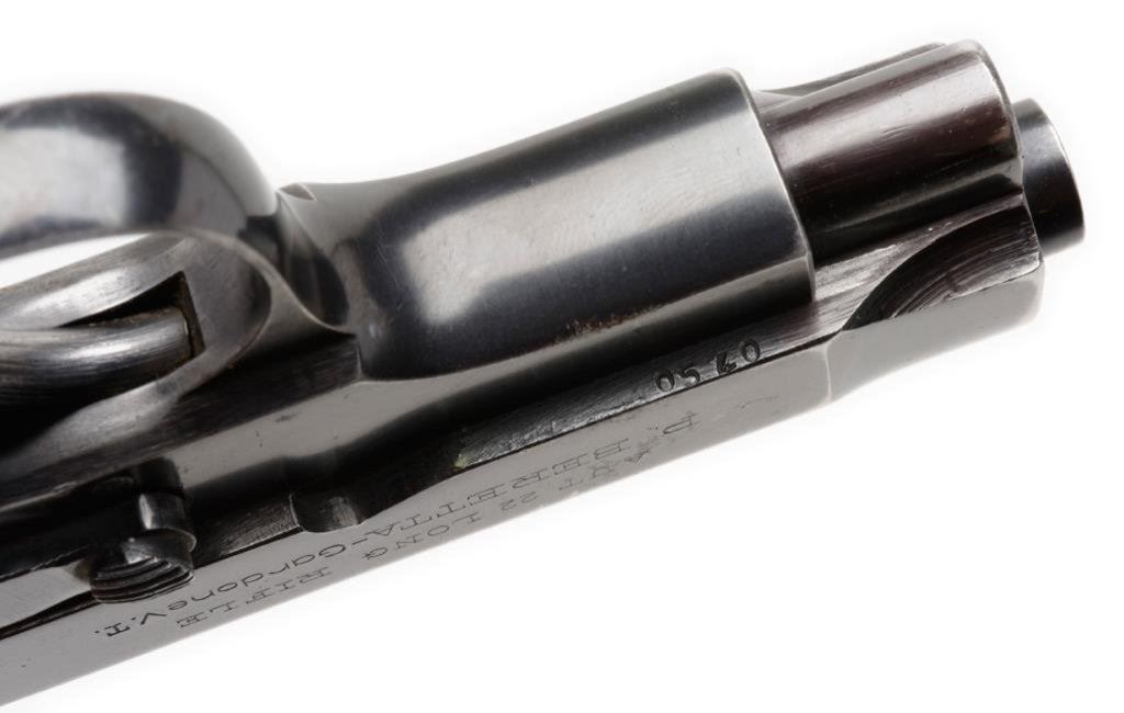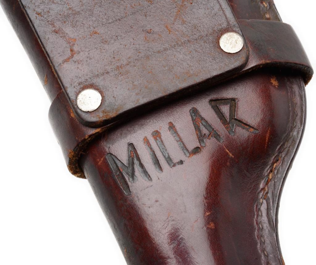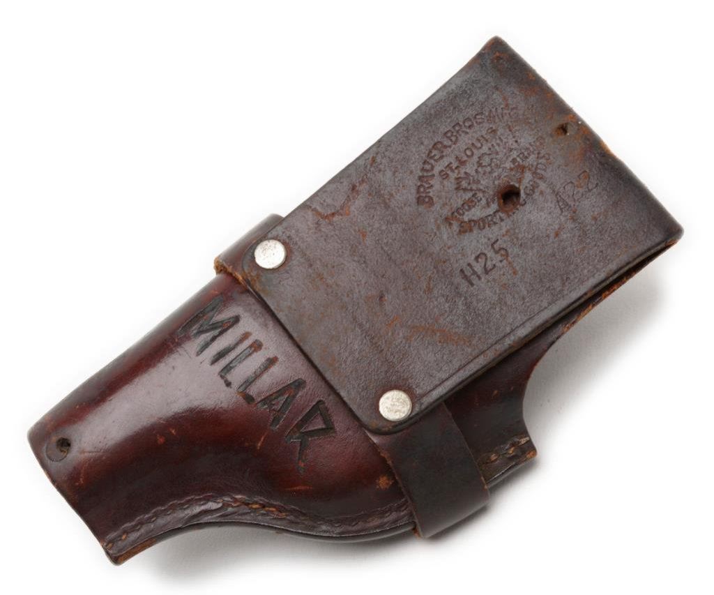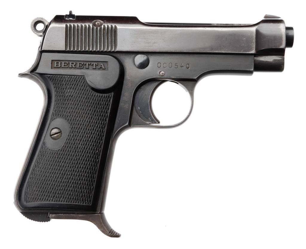 ++Beretta Model 1934 semi-automatic pistol, .22LR caliber, 3.25” barrel, S/N OC0540, blued finish, checkered hard rubber grips, with cut down leather holster by Bauer Bros., St. Louis and marked on back “MILLAR”. This gun is in overall very good + condition showing considerable original finish with high point and muzzle wear. The bore is good, the action and markings are crisp and the grips are very good overall. Est.: $250-$500.