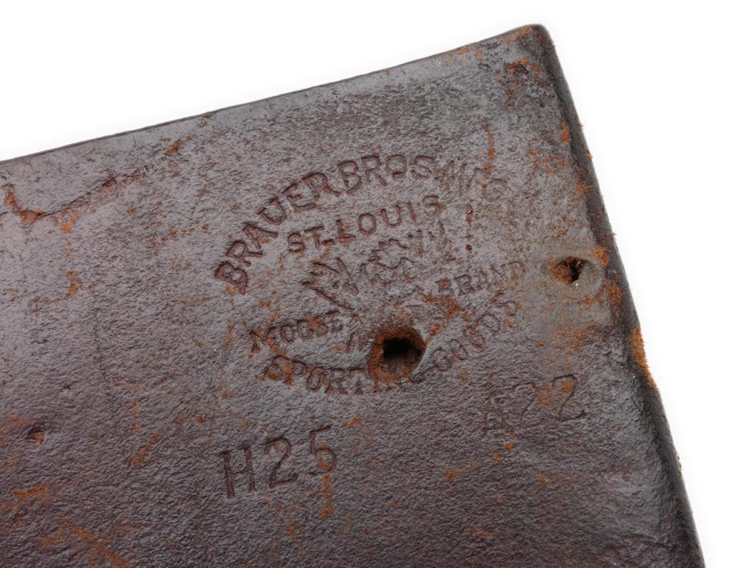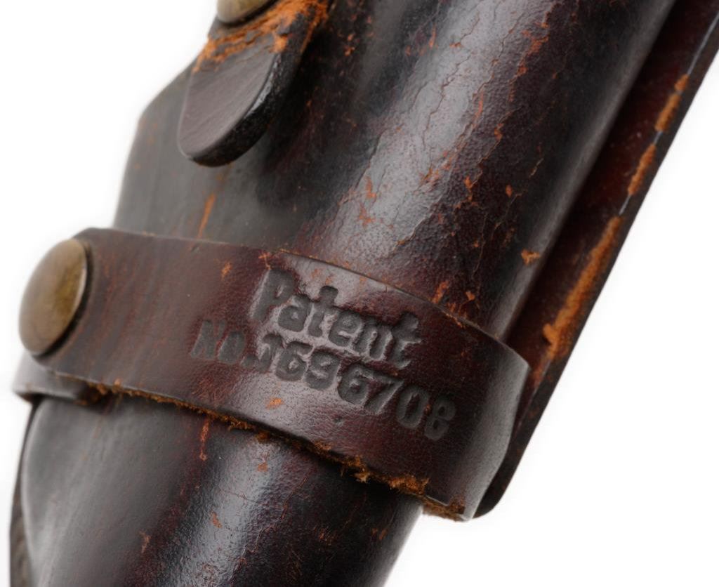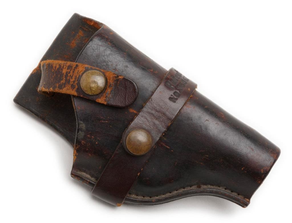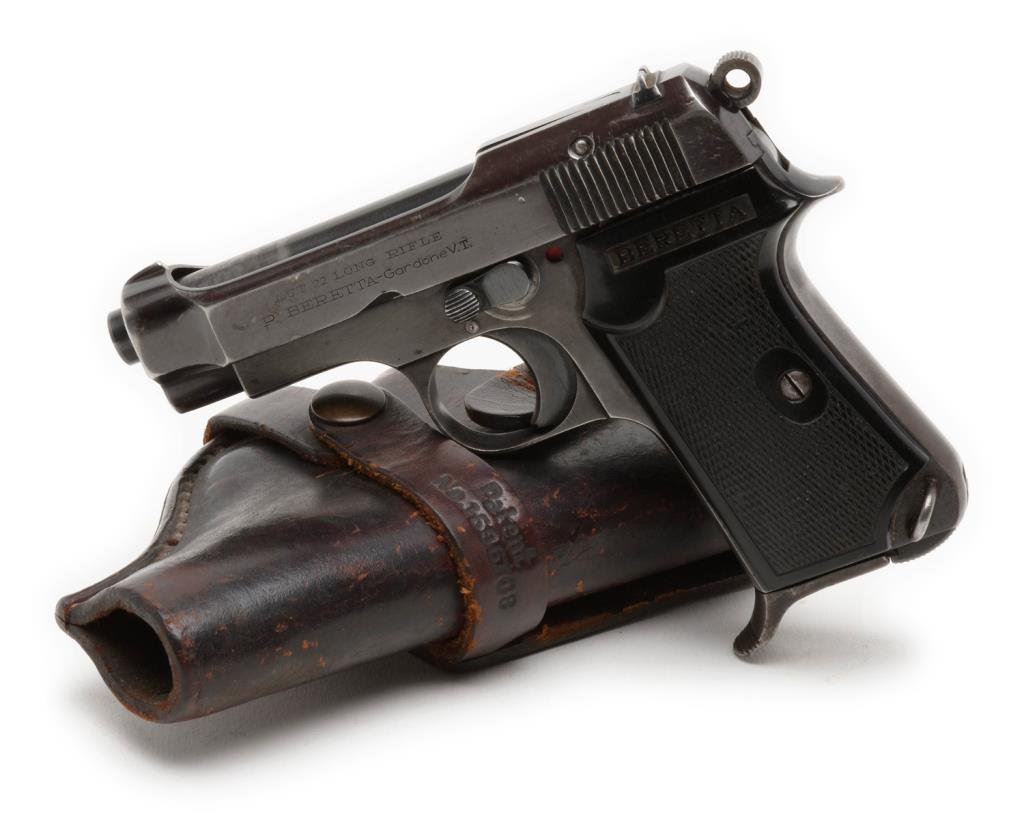 ++Beretta Model 1934 semi-automatic pistol, .22LR caliber, 3.25” barrel, S/N OC0540, blued finish, checkered hard rubber grips, with cut down leather holster by Bauer Bros., St. Louis and marked on back “MILLAR”. This gun is in overall very good + condition showing considerable original finish with high point and muzzle wear. The bore is good, the action and markings are crisp and the grips are very good overall. Est.: $250-$500.