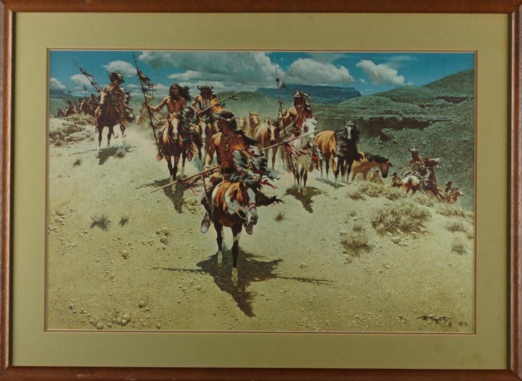Large framed and double matted color print of Indian warriors on horseback entitled “Comanche Moon” by noted Western artist Frank McCarthy (1924-2002), approximately 24” x 33” overall. Est.: $200-$400.