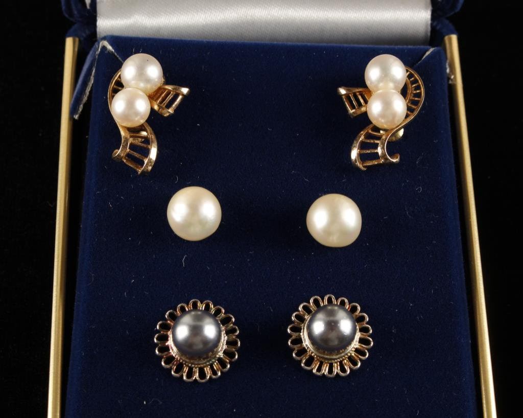 Lot 1375 3-pairs of pearl earrings, 2-white pearls set in gold and 1-black pearl in