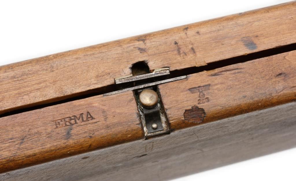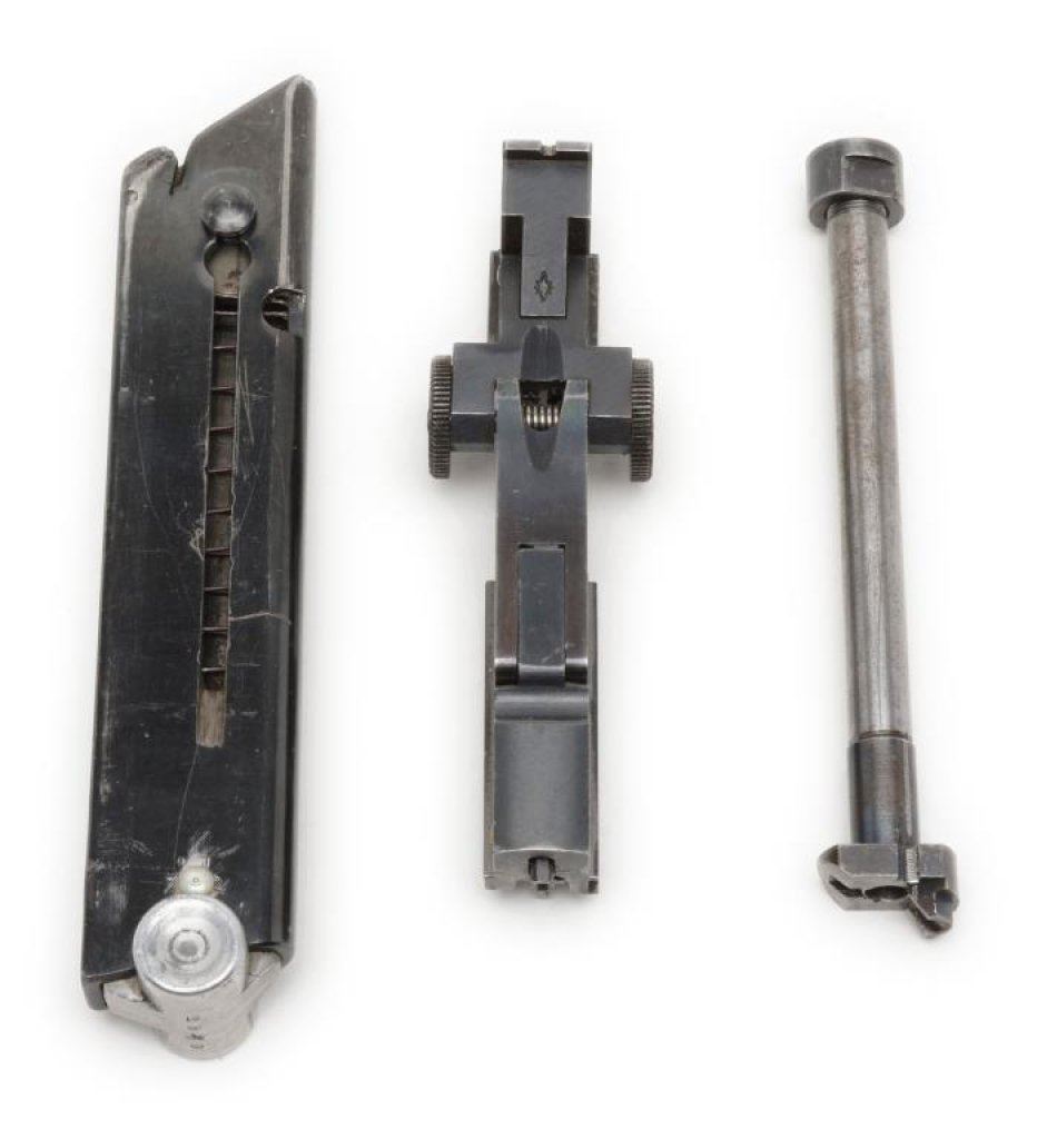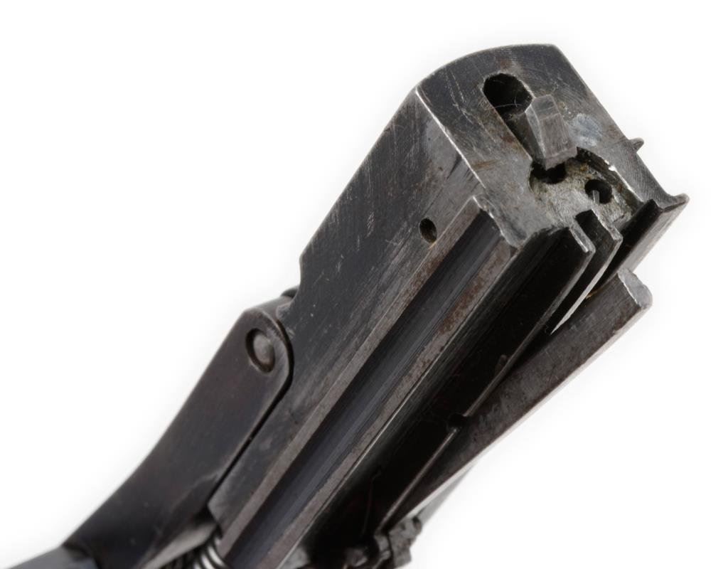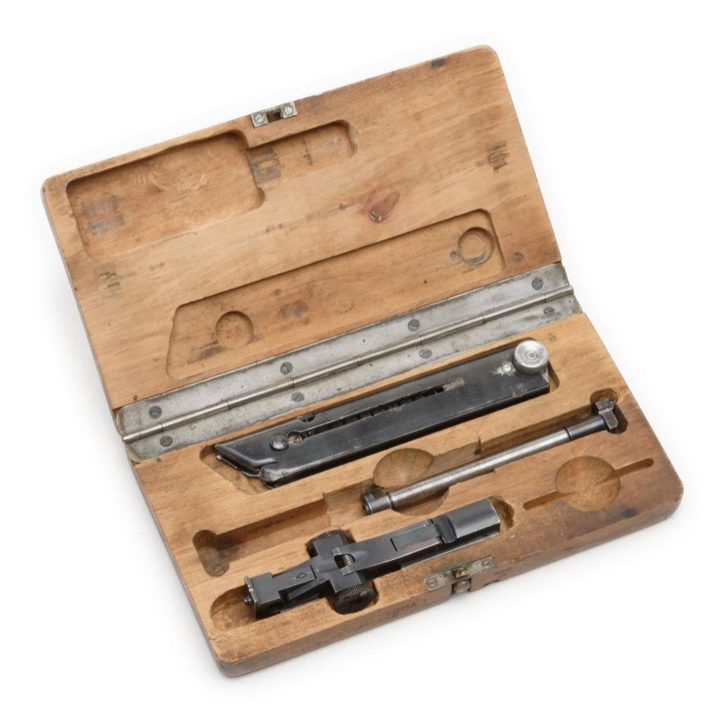 Luger .22 caliber conversion unit with Nazi proofs in wood case. Eagle 77 proof on the clip. Erma and 280 eagle proof on the case. Includes toggle, BBL and clip. Showing most of it’s original finish. Missing small parts. Very unusual to find Nazi proofed and clip alone valued at over $300. Est.: $350-$700