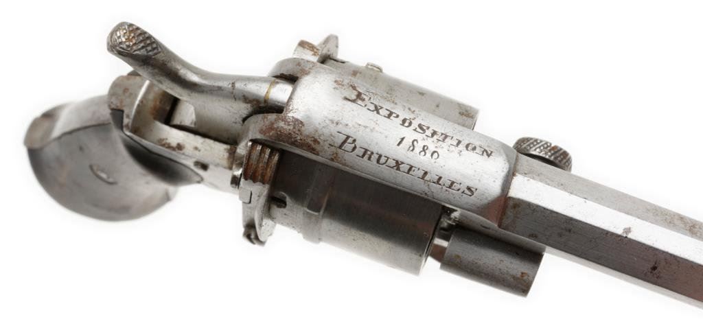 Pinfire revolver engraved on the top strap “Exposition 1880 Bruxelles”; good action, wood grips, bright finish. Est.: $250-$500.