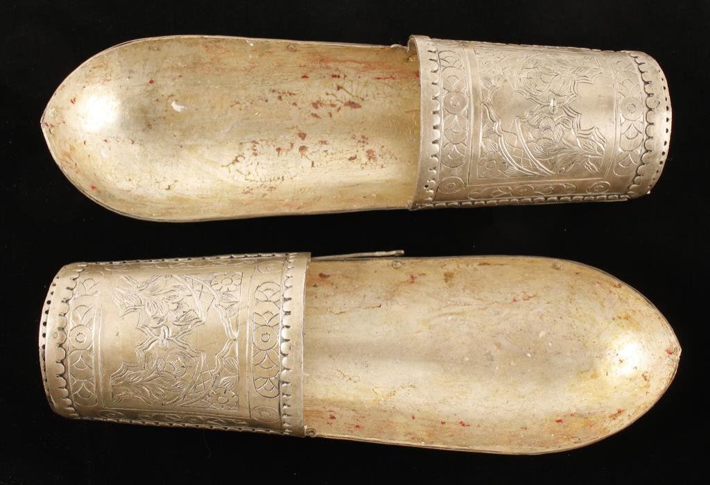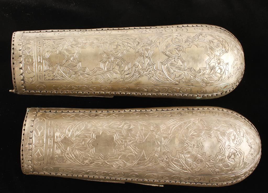 Late 19th to early 20th Century arm guards with engraving and silver wash for parades and ceremonies; each approximately 13” long and 4” wide. Est.: $300-$600.