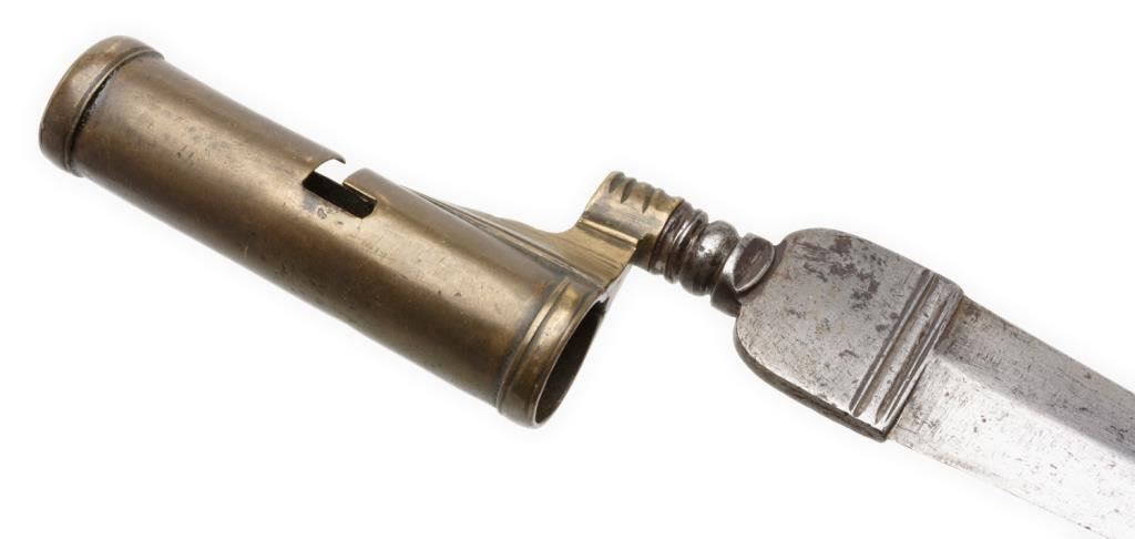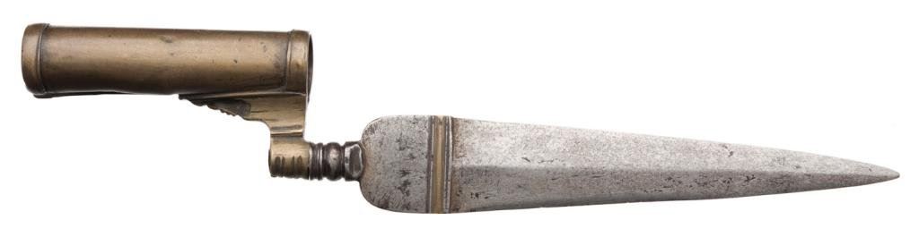 Italian 18th Century bayonet for hunting boar; approximately 10.25” overall with a 6.25” blade. Est.: $250-$500.