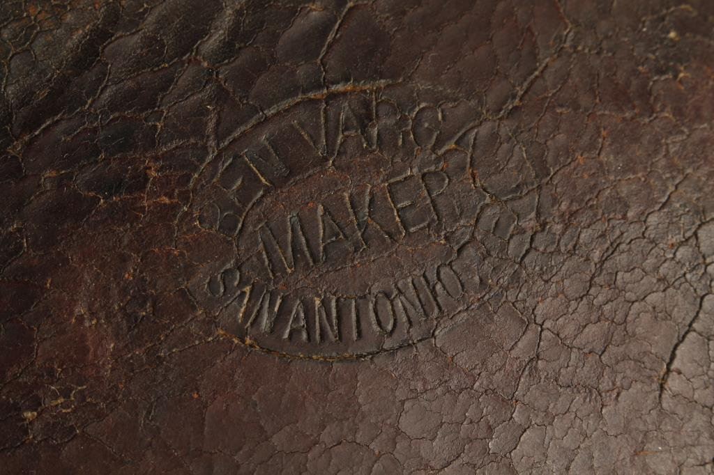 Leather basket weave tooled scabbard for presumably a carbine or trapper’s model length lever action rifle marked “BEN VARGA/MAKER/SAN ANTONIO/TEX” in somewhat worn condition; a great Western maker! Est.: $400-$800.