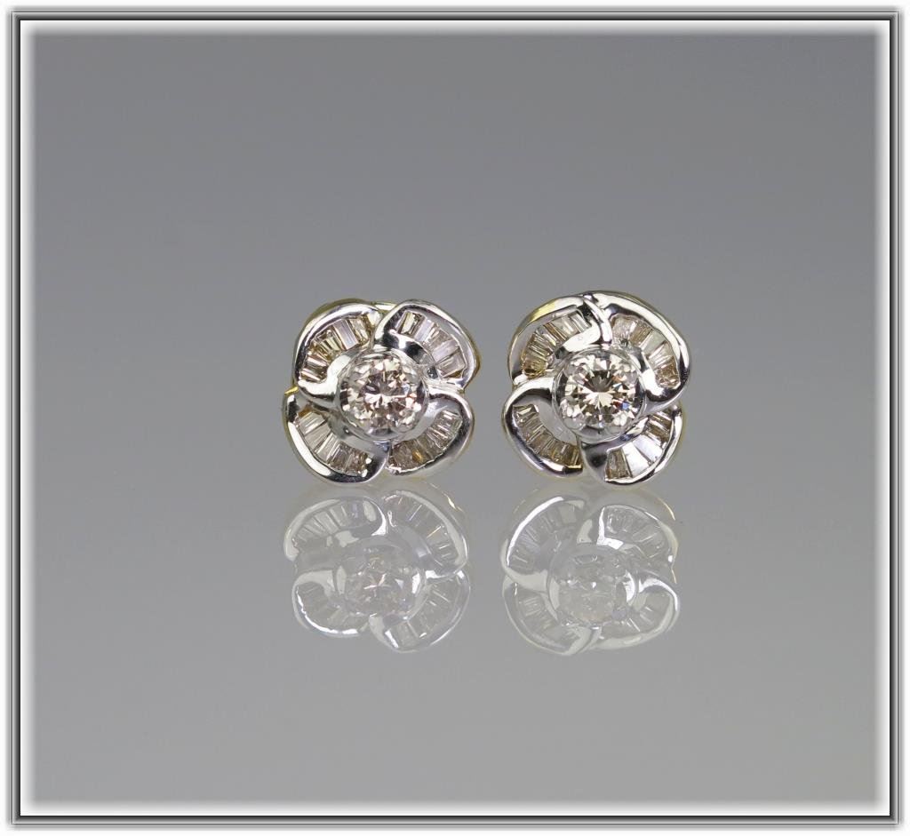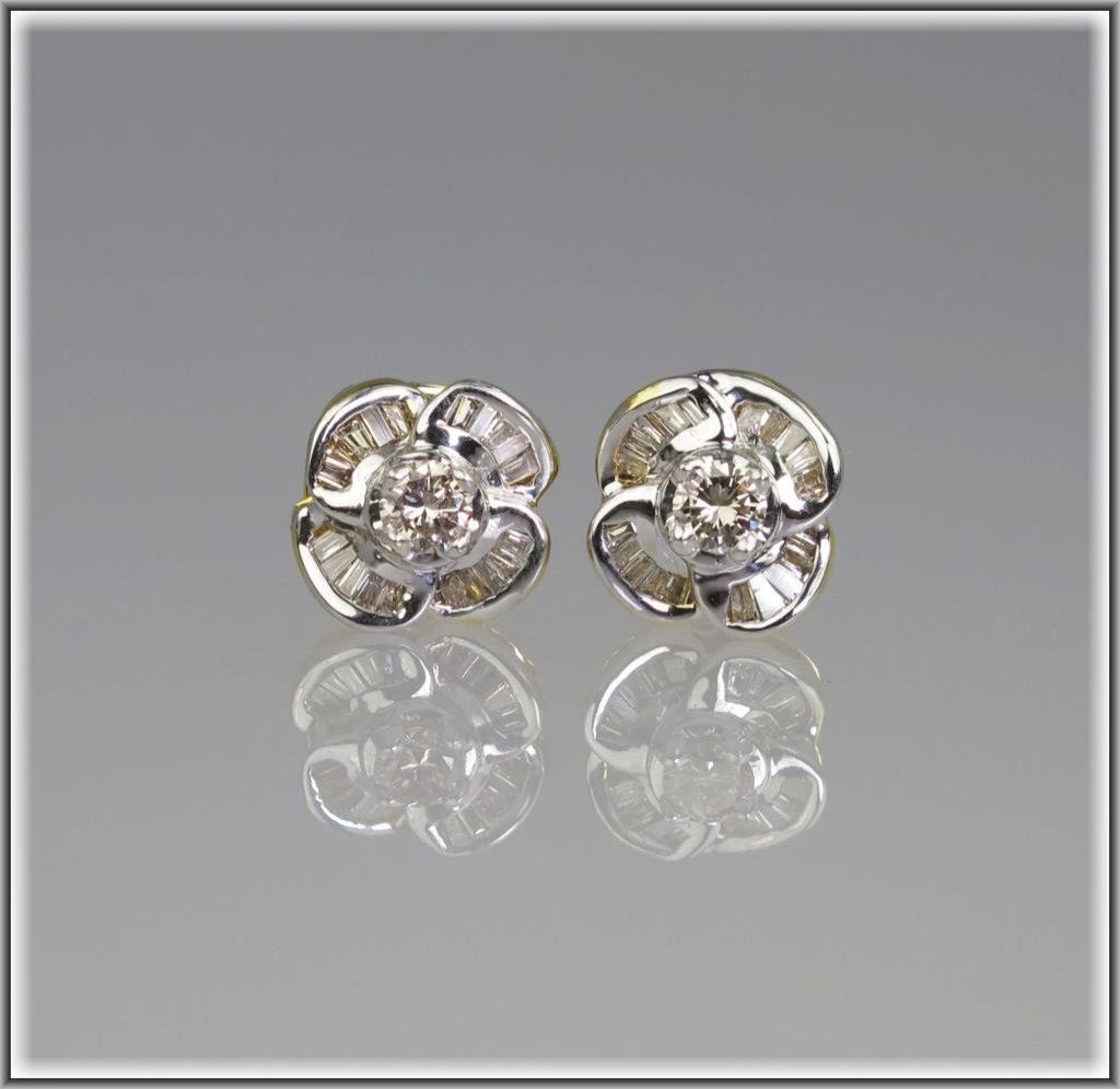 Brilliant Diamond Earrings in Flower Design with 2 round cut and 40 baguette cut Diamonds weighing approx. 1.50 carats total with I-J colors and VS/SI clarity set in 14 karat yellow gold. Retail $2,000-$2,600 Estimate $1,200-$1,800