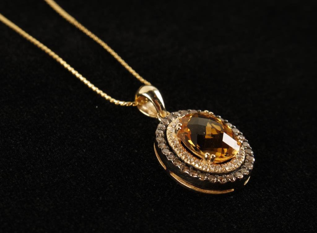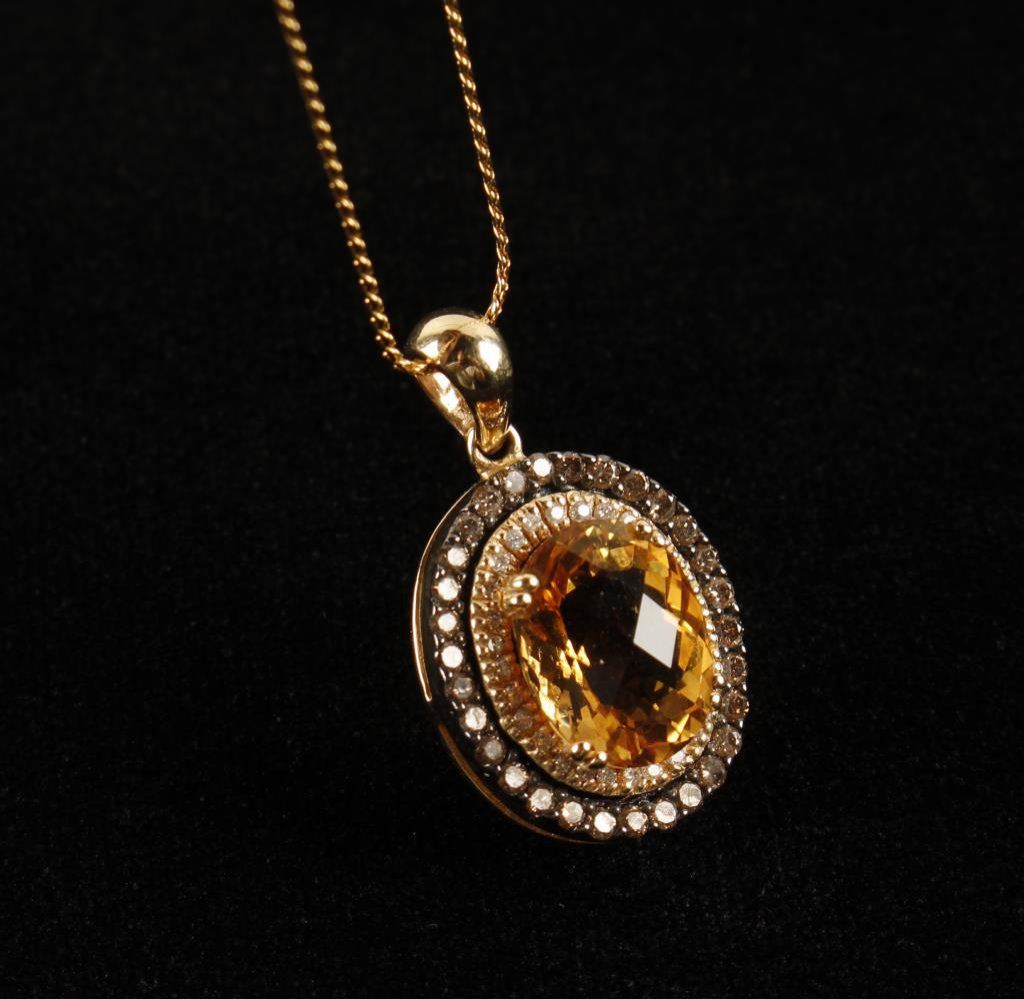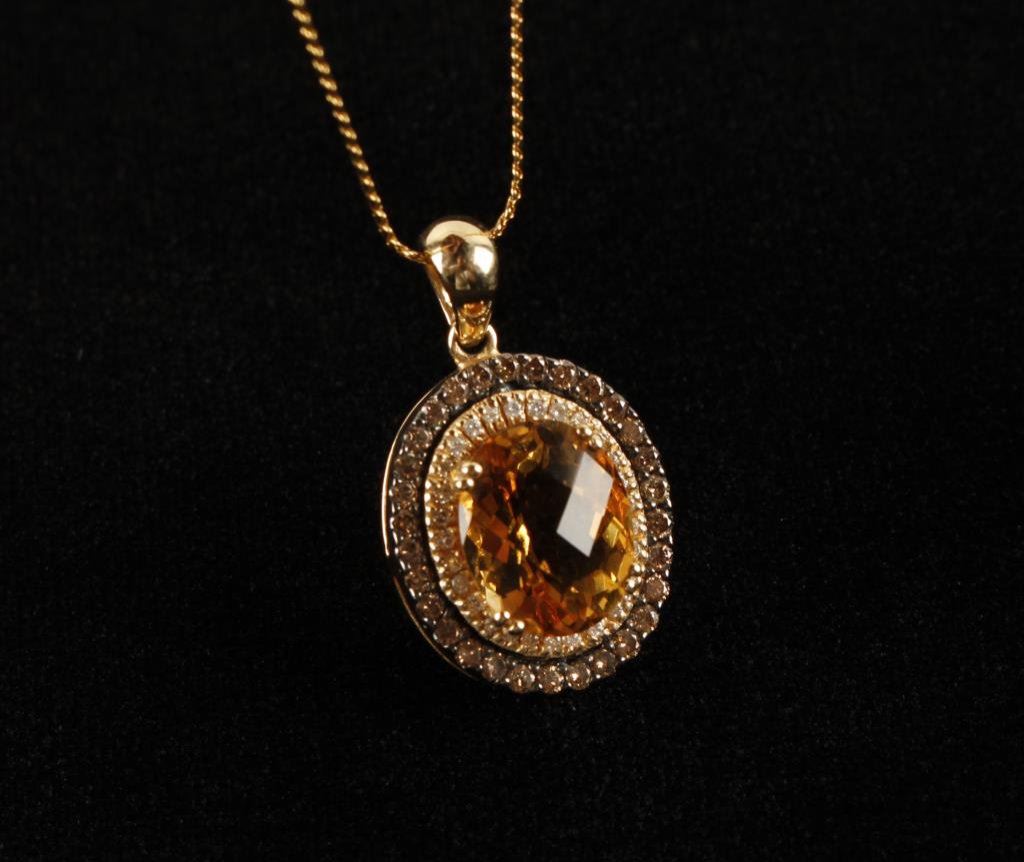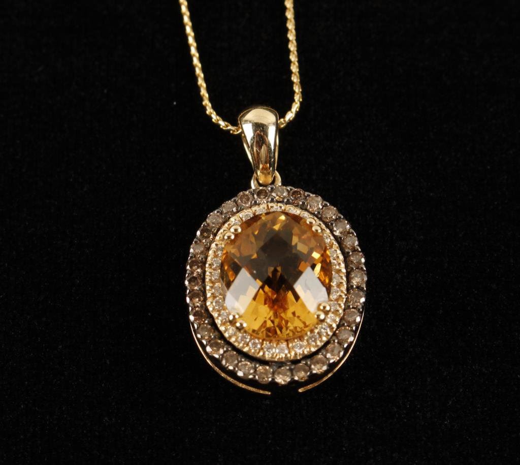 Designer Pendant set with an oval Citrine (approx.5 carats) surrounded by a row of white Diamonds and a row of champagne Diamonds with a 14K chain.Est.:$2,000-2,500