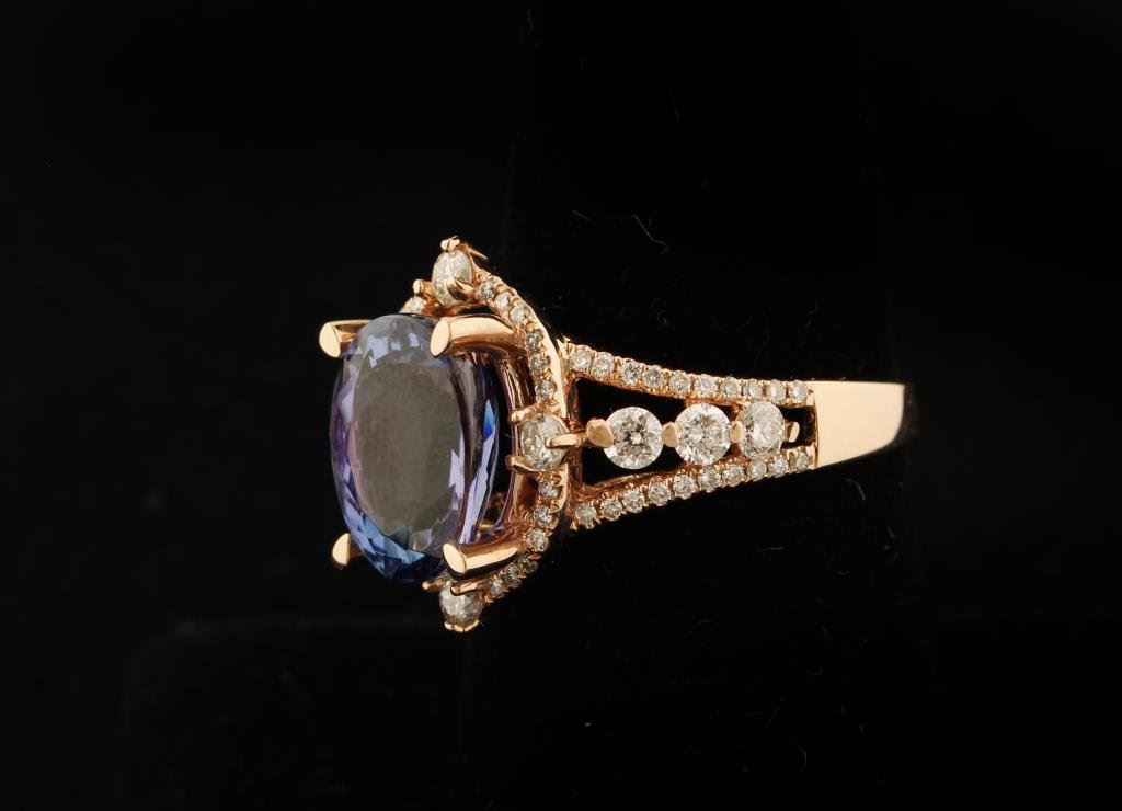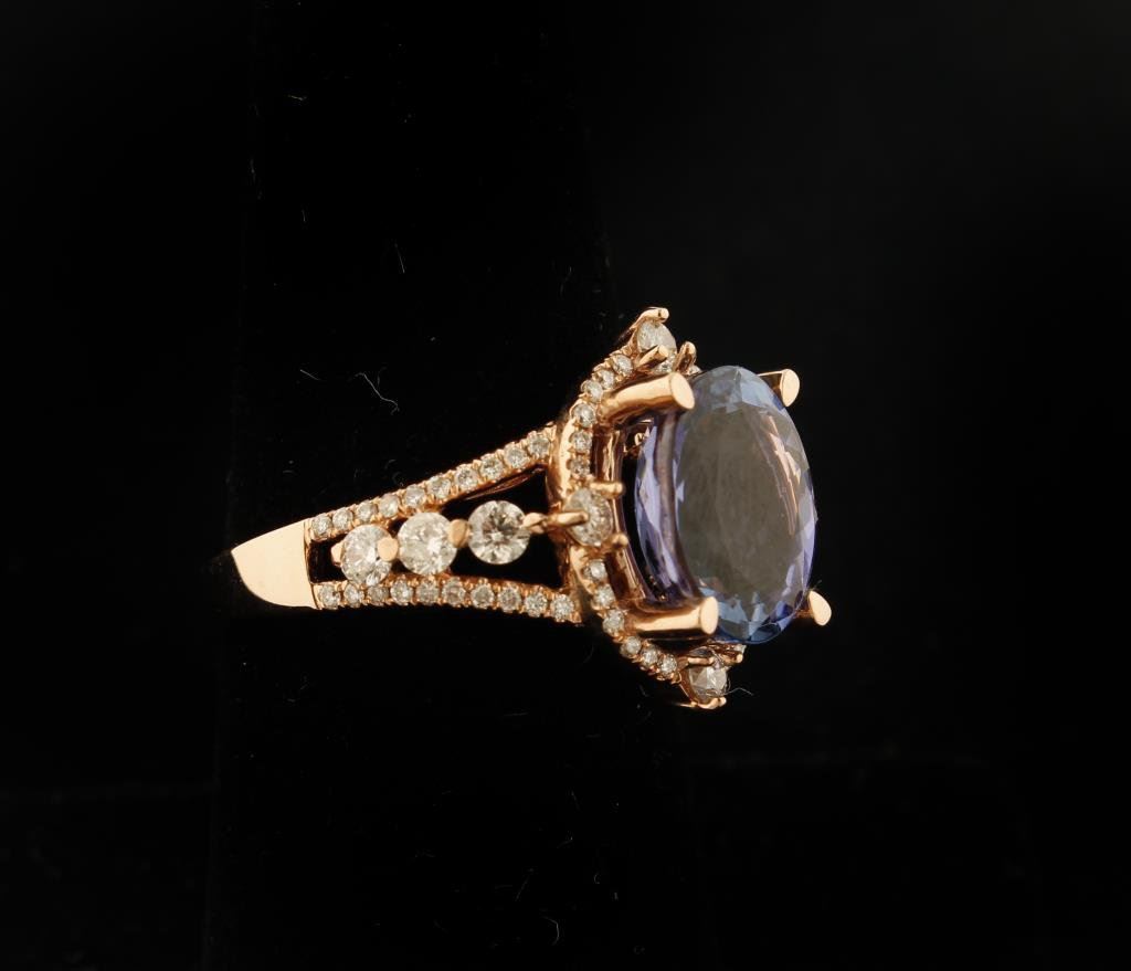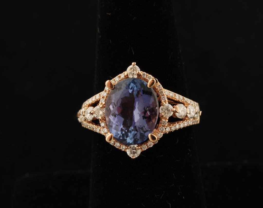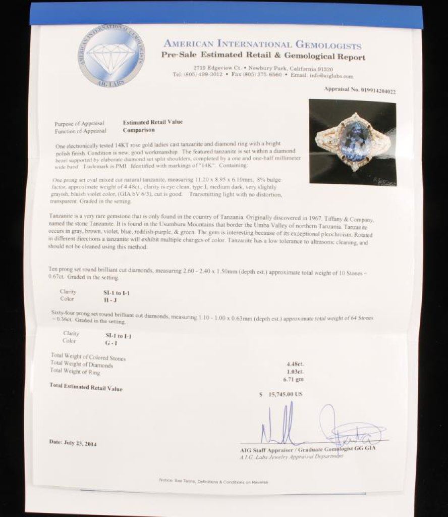 Tanzanite approx. 4 1/2 carats with 1.03 estimated accenting Diamonds in 14K gold. Appraised by A.I.G. of Newbury Park for Retail Replacement $15,745. Est: $1,750-3,500
