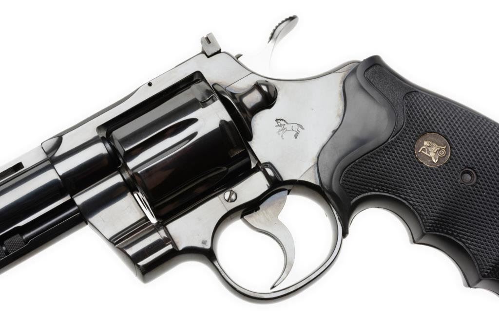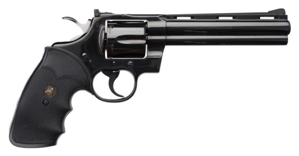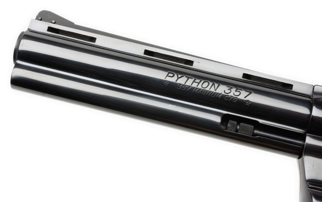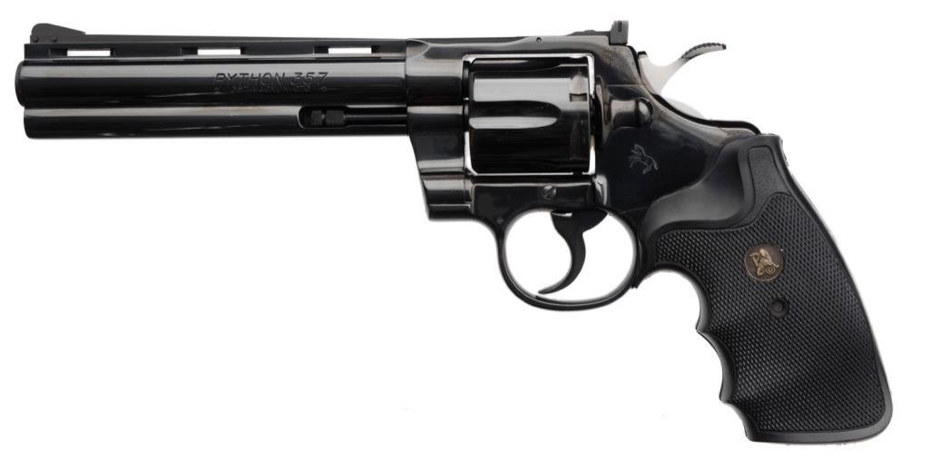 * Colt Python revolver, .357 Magnum caliber, serial #K12763. A beautiful Colt Python with desirable 6” Python marked barrel, high gloss blued finish and black Pachmayr finger grooved medallion combat grips. The pistol is in overall excellent condition showing little if any use and only slight handling marks. The bore is excellent, action crisp and markings are sharp. The pistol has a full-length ventilated rib with ramp front and adjustable rear sights. Just a really nice Python. Est.: $2,000-$4,000.