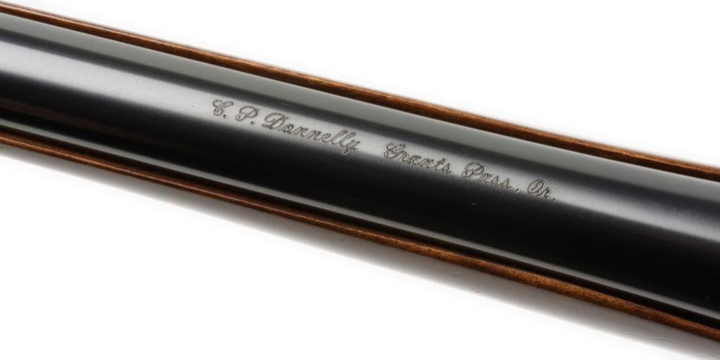 Custom Winchester Model 1895 lever action rifle, .405 Winchester cal., serial #05627PW187. The rifle is in overall very good condition as customized. The 1895 action has been re-barreled and customized by noted gunsmith C.P. Donnelly of Grants Pass, Oregon. The rifle had a custom ramp front sight, barrel band swivel mount and period Redfield appeture sight added. The smooth wood stocks are in very good condition showing small mars and compressions consistent with use. The buttstock ends with a smooth metal butt plate. The bore is very good, the action crisp and markings sharp on this custom rifle. Est.: $700-$1,000.