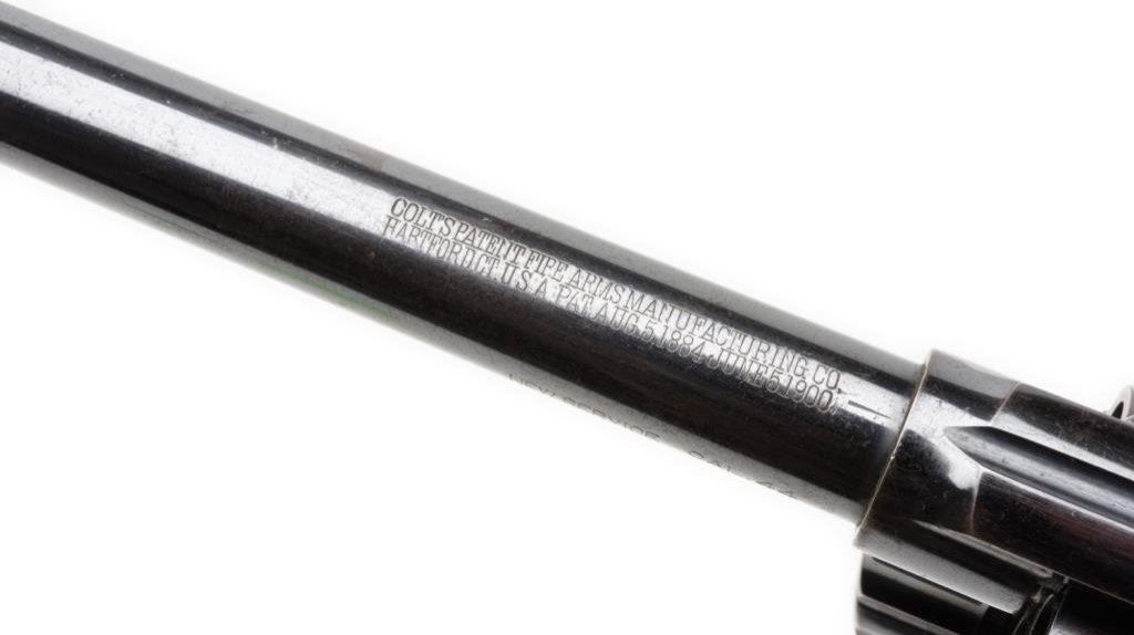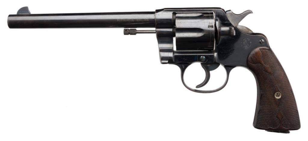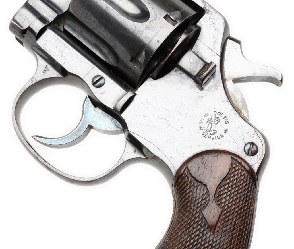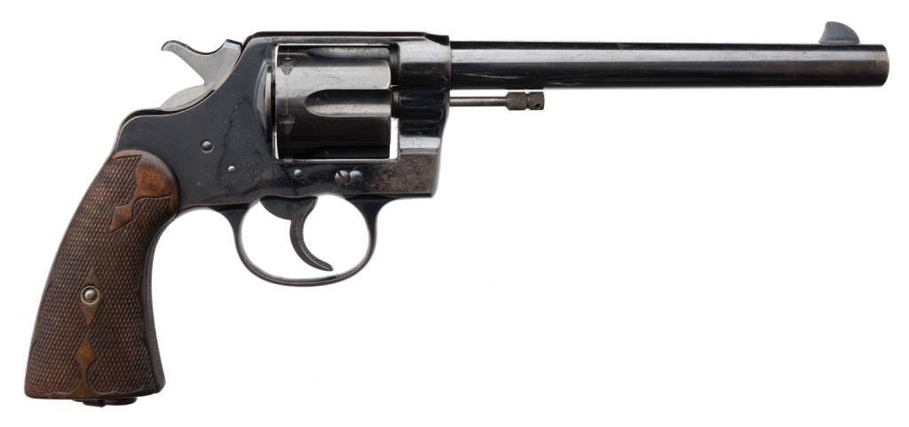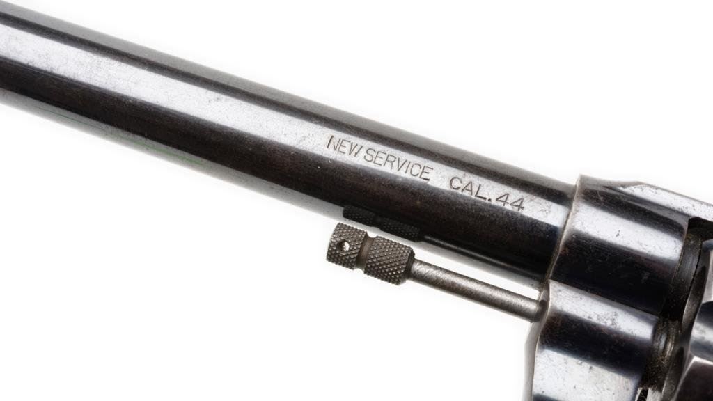 **Colt New Service DA revolver, .44 caliber, 7.5” barrel, S/N 18992, blued finish, lanyard ring, checkered fleur d’ lis wood grips in overall fine condition with crisp action and fine bore. Consignor’s note on gun states “9-10-1907 Schoverling Daly, NYC, factory checkered straps and trigger” but no factory letter accompanying to confirm. Est.: $1,250-$2,500.