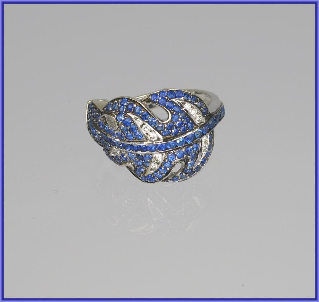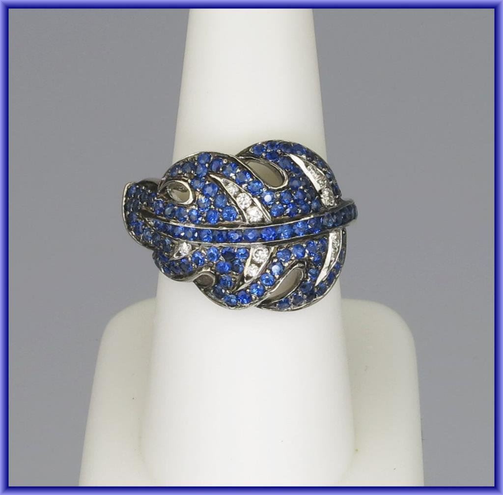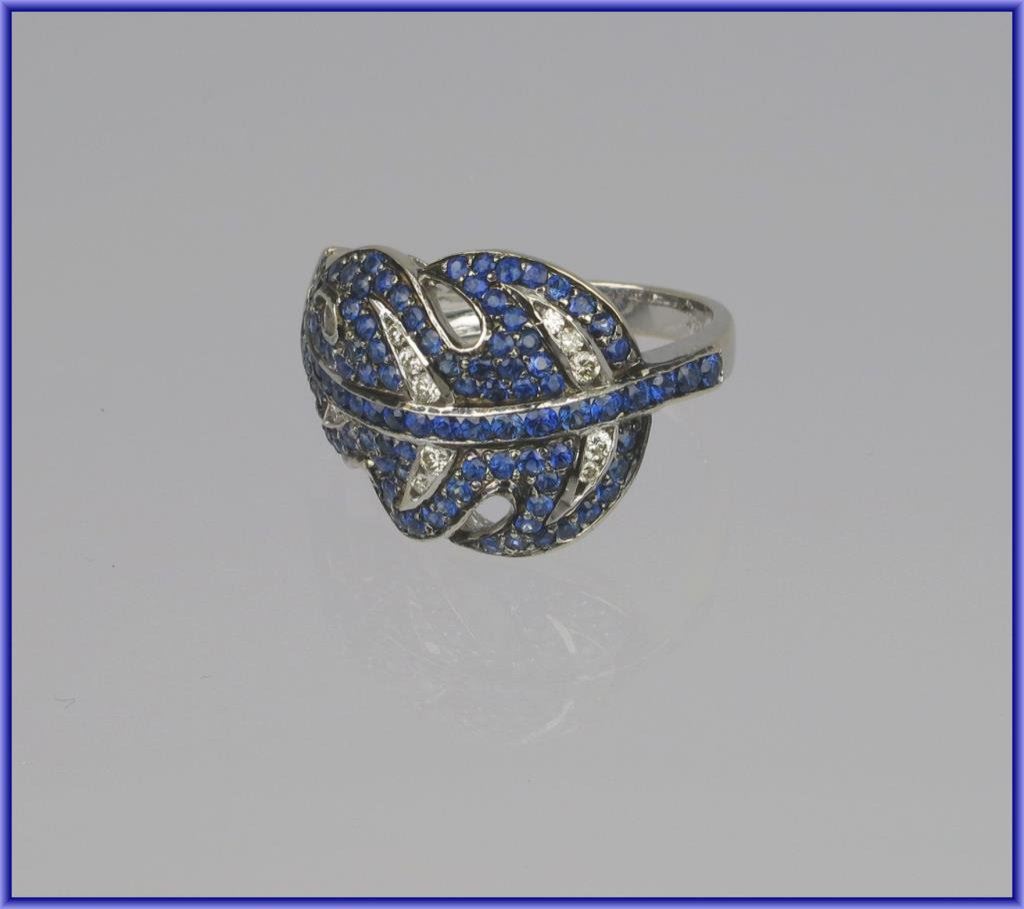 Sophisticated Cartier Style Blue Sapphire and Diamond Ring in leaf design with 102 round cut sapphires weighing approx. 3.00 carats and 11 round cut Diamonds weighing approx. 0.20 carats with H-I colors and VS clarity set in 7.4 grams of 14 karat white gold. FINE Estate Piece. Retail $2,600-$3,000 Estimate $1,200-$1,800