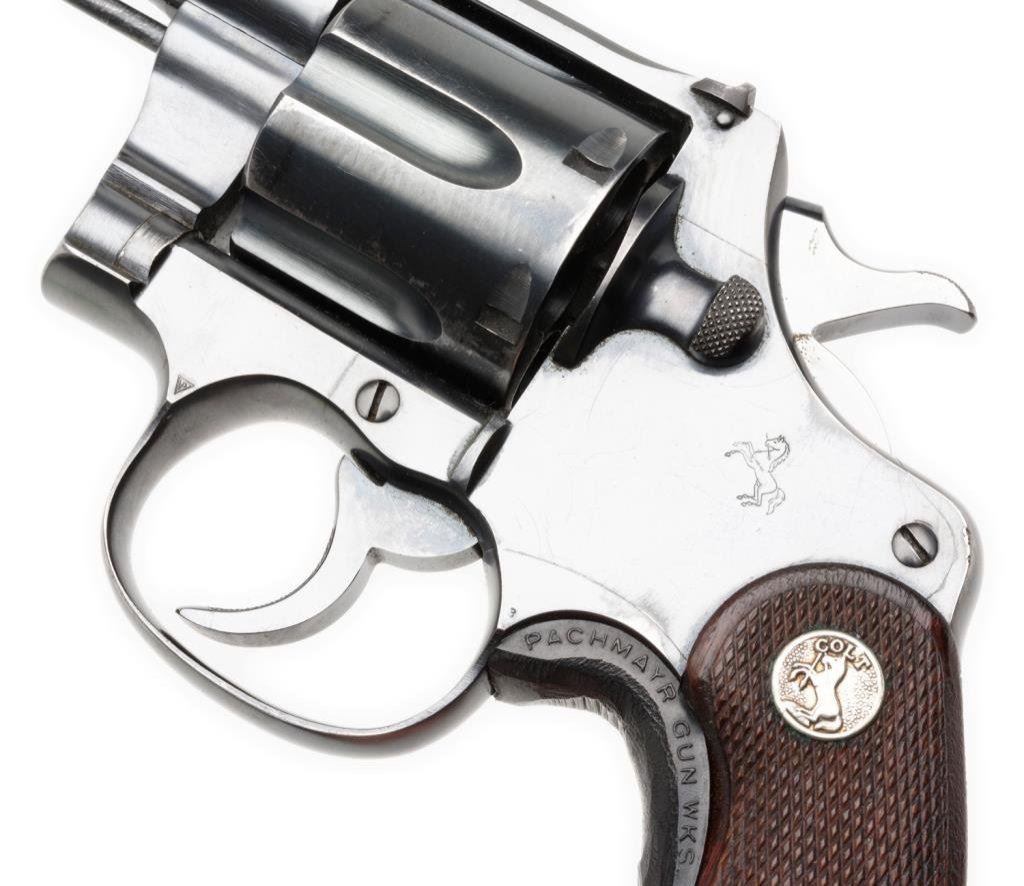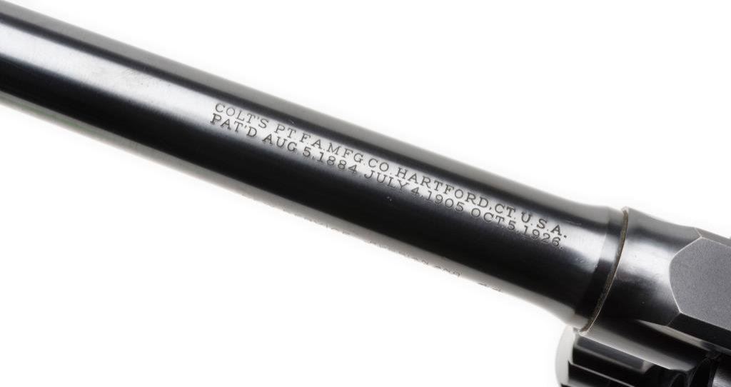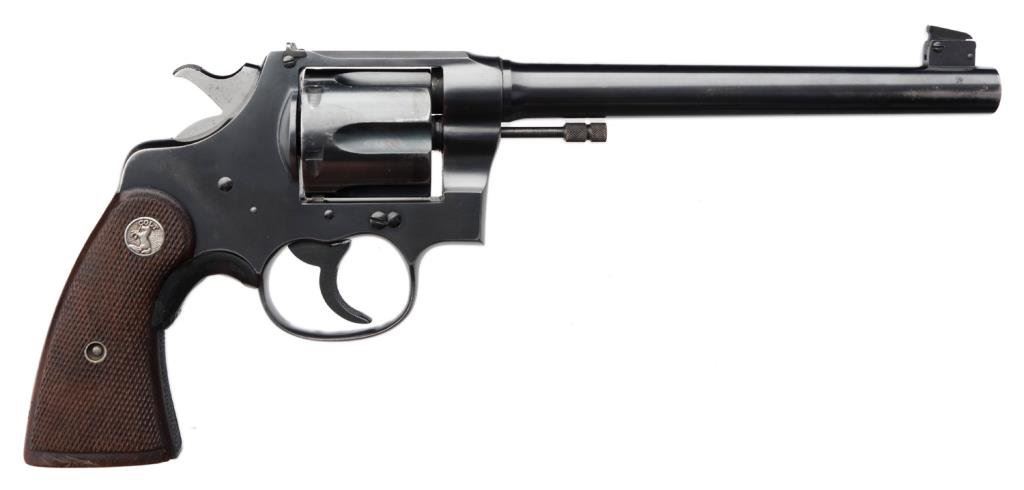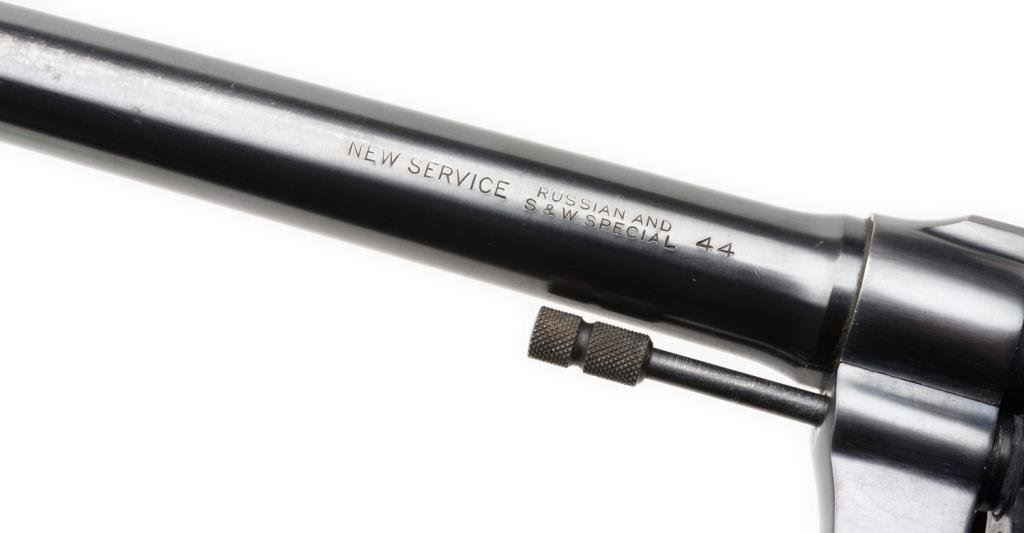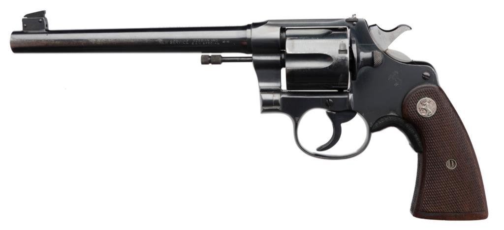 **Colt New Service Flat top Target DA revolver, .44 Russian and S&W Special, 7.5” barrel, S/N 328057, blued finish, checkered wood medallion grips with grip adapter; in overall fine condition showing the majority of its original finish, crisp action and markings, fine bore overall. Accompanied by a factory letter that notes “the records apparently were lost or destroyed years ago”. Est.: $1,600-$3,200.