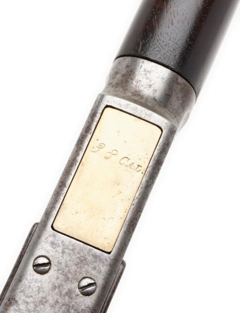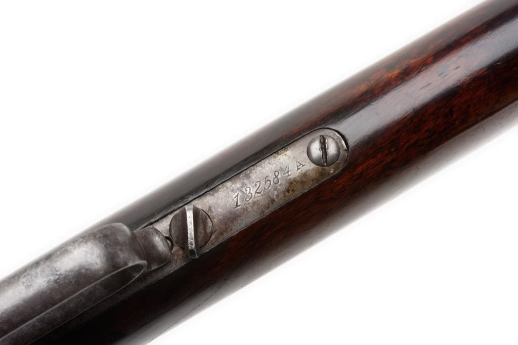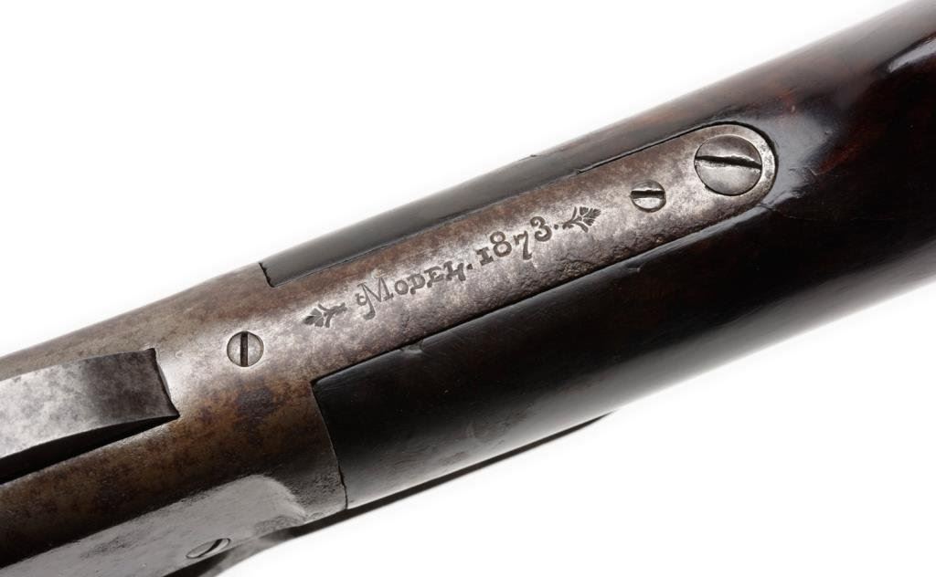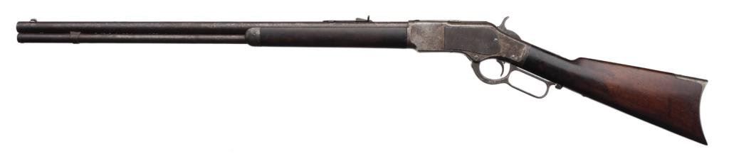 Winchester Model 1873 semi-deluxe special order lever action rifle, .38-40 caliber, 26” round barrel, S/N 132584A, blued and case hardened finish, set trigger (working at time of description); wood stocks in overall good to very good condition displaying a dark patina to barrel assembly with scattered surface erosion; primarily grey patina to receiver with some silver tone, crisp action, good markings and good to very good bore. The wood stocks are good with better-than-average graining to the butt stock that also shows an old “V” shaped crack on the left side behind the wrist. Original factory letter confirms features and notes “Received in the warehouse on September 26, 1883” and “Shipped from the warehouse on September 29, 1883 to order number 7419”. Est.: $2,500-$5,000.