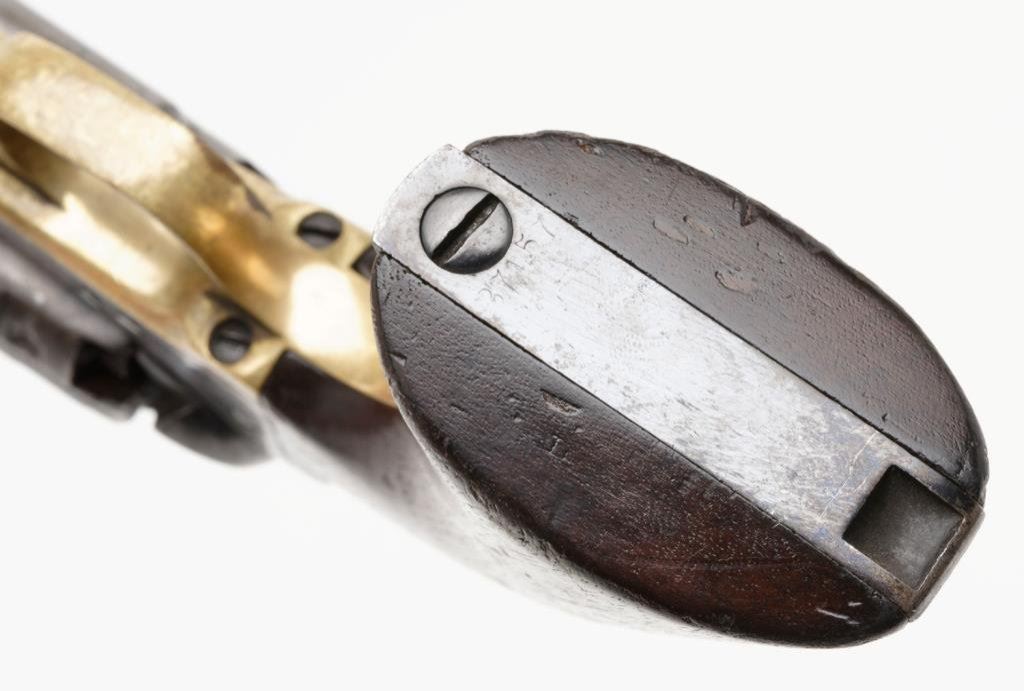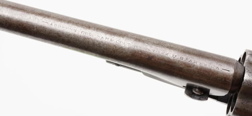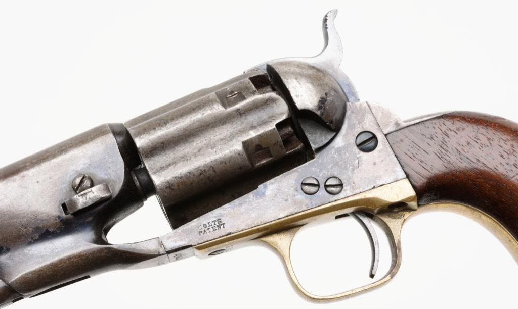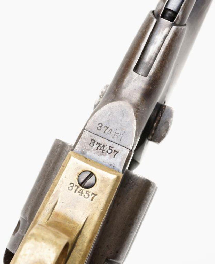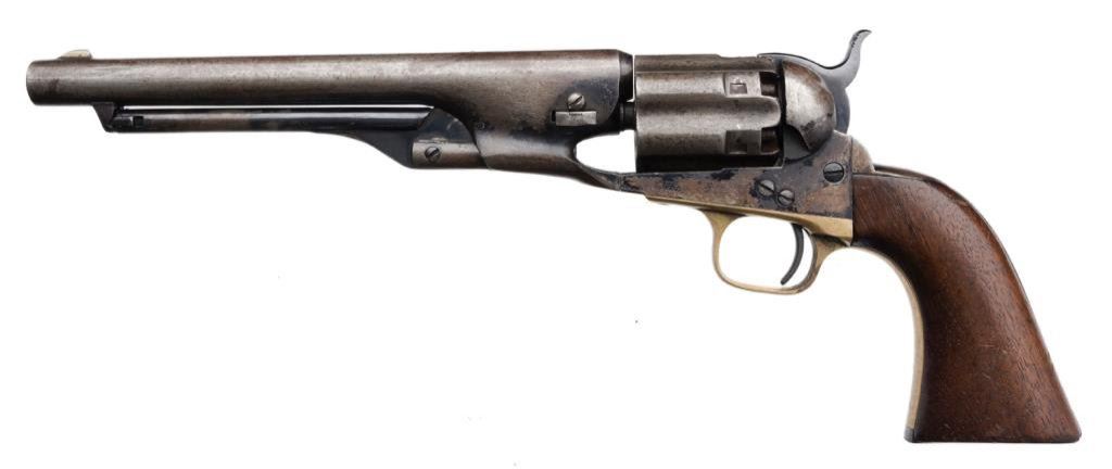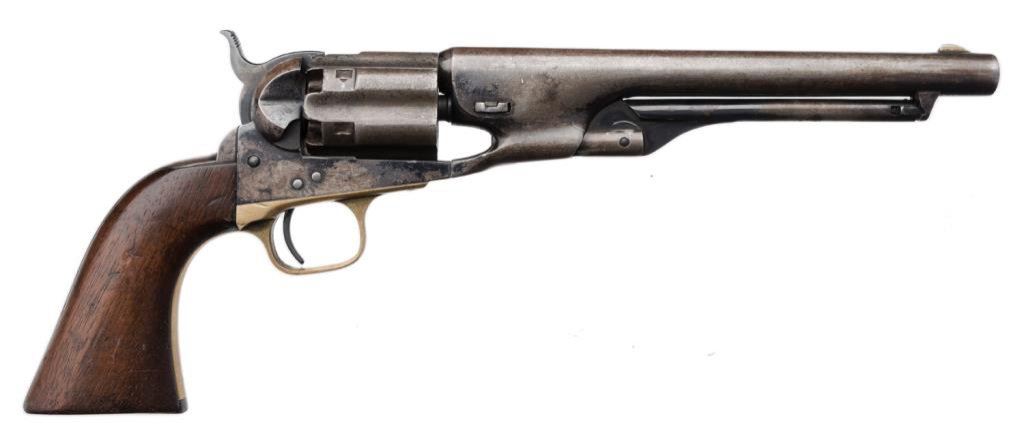 Colt Model 1860 Army percussion revolver, .44 caliber, 8” barrel, blued finish, brass trigger guard, iron backstrap, S/N 37457, all matching numbers including the wedge and cylinder arbor although interestingly, the gun has a fluted cylinder; wood grips. The gun is in overall very good + condition showing traces of what appears to be an old re-blue including finish on the hammer and loading lever as well as the barrel assembly and the case hardened frame; crisp action, good markings and overall good bore with some scattered pitting. Fluted cylinder is in similar condition to the rest of the gun and retains its pins on the back of the cylinder face. Est.: $2,000-$4,000.