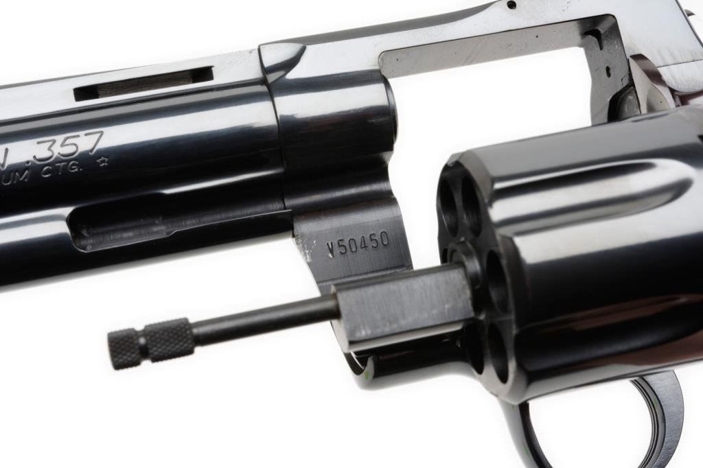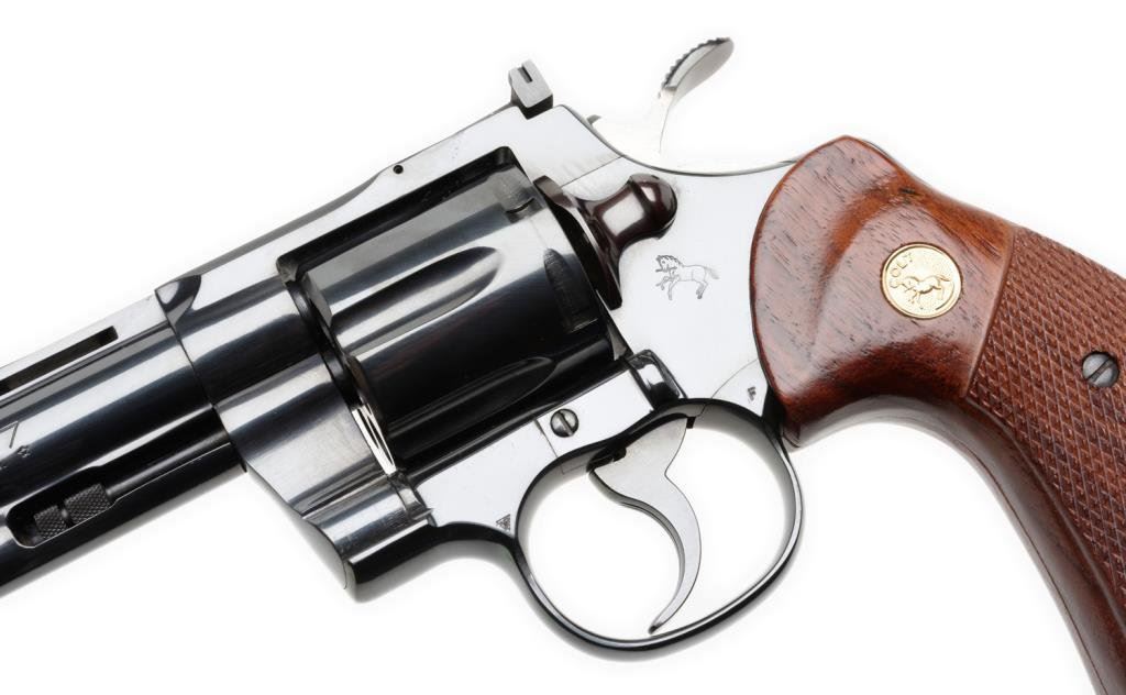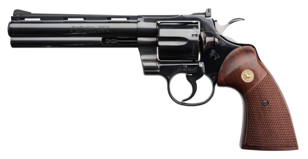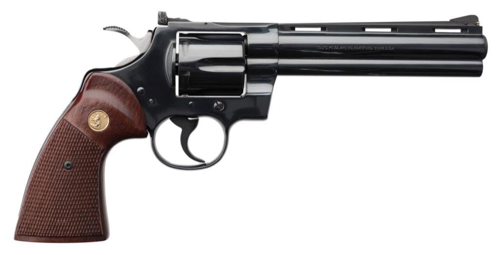 *Colt Python DA revolver, .357 magnum caliber, 6” ventilated rib barrel, S/N V50450, (ca 1979), blued finish, checkered wood medallion grips in overall like new condition showing little use. Est.: $3,000-$6,000.